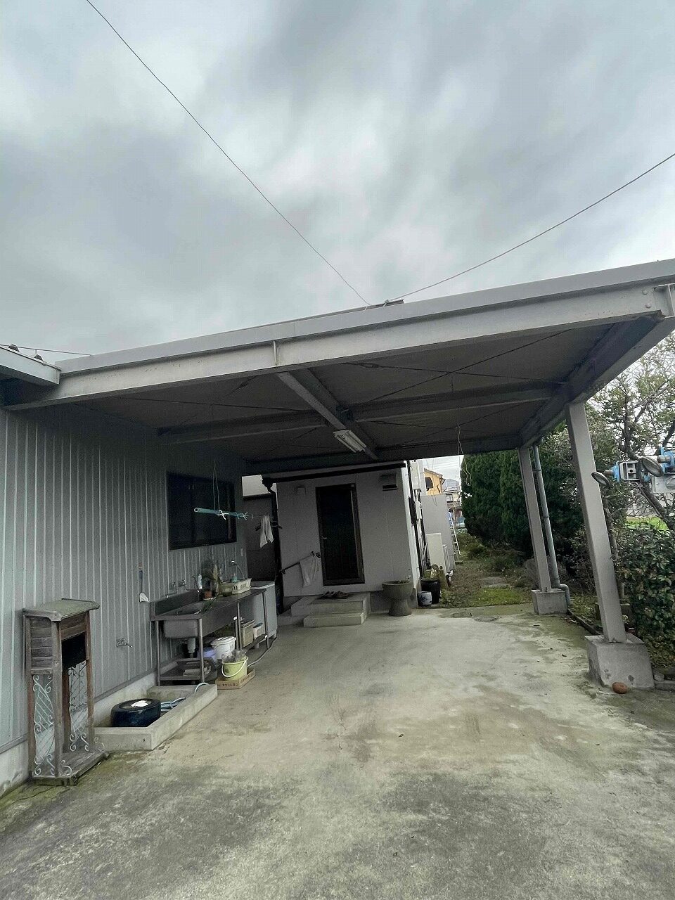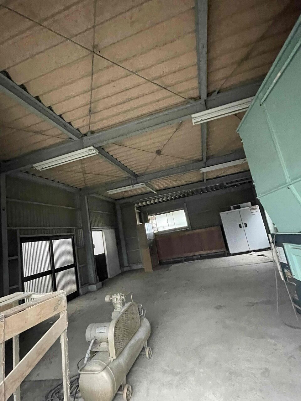 右側の写真の倉庫内にあった荷物を移動し、足場がなくても手の届く場所のケレン(下地処理)作業を行いました。