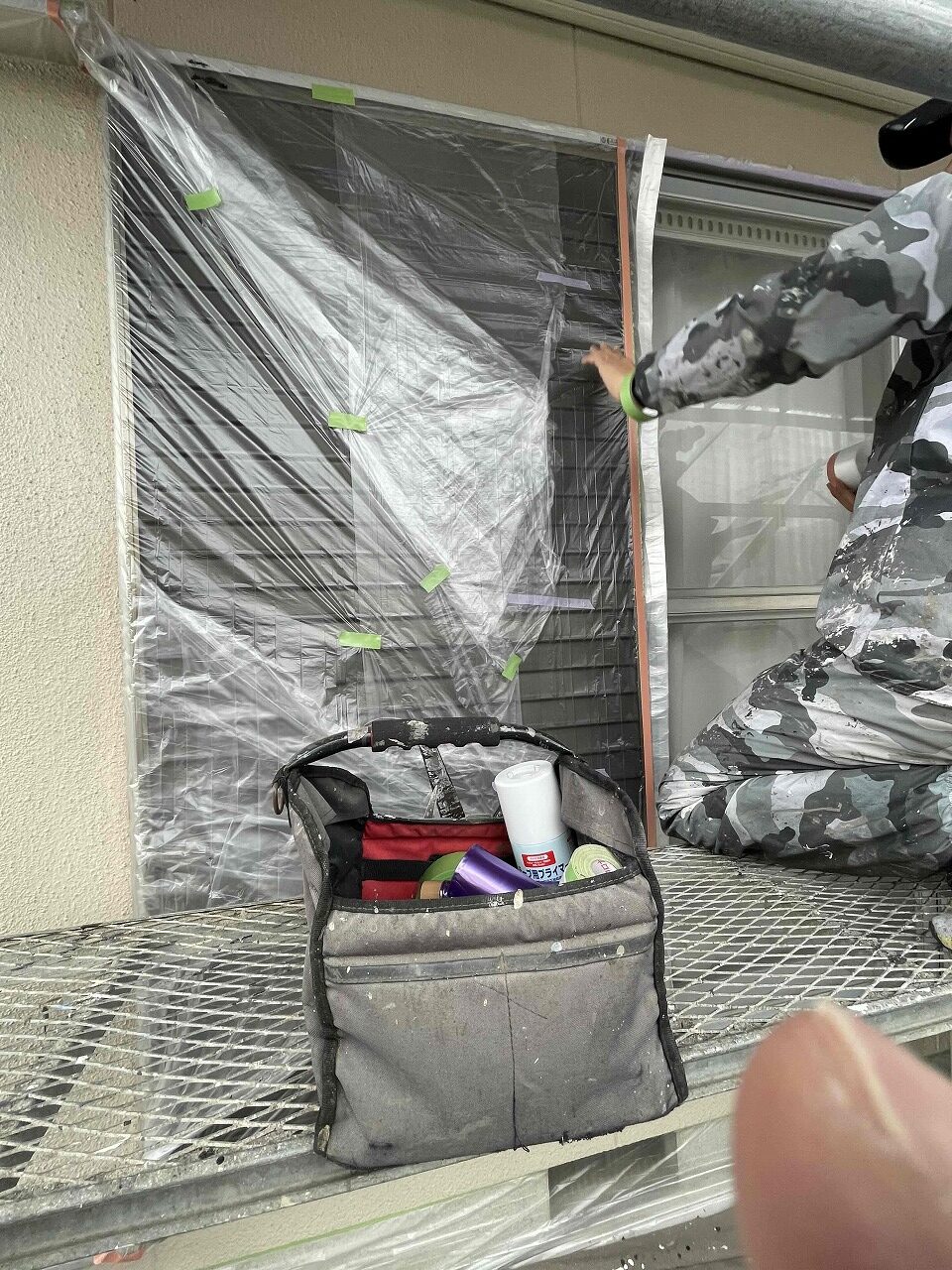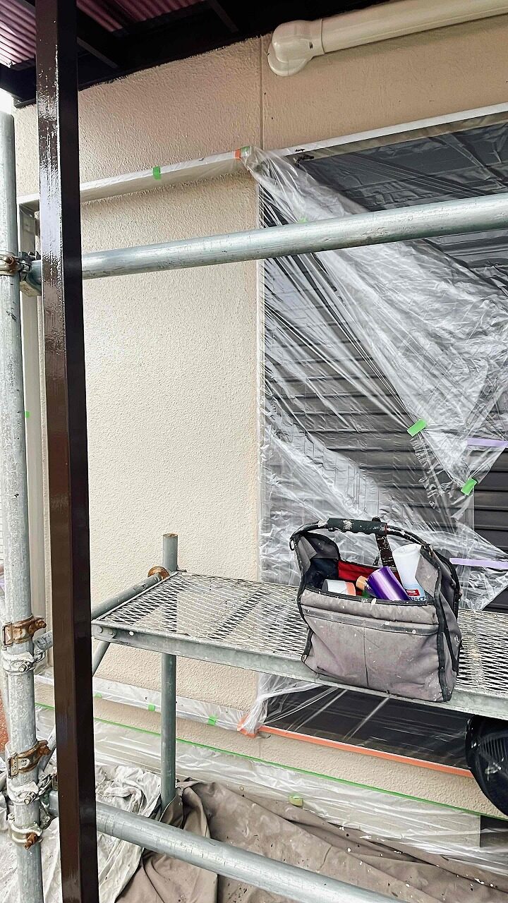 塗装しない場所に塗料が付着しても大丈夫なよう、丁寧に養生作業を行っていきます。