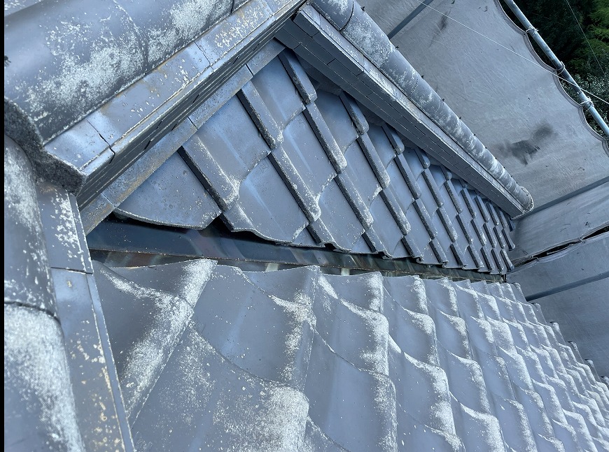 左の写真:谷の瓦が何枚か落ちているため、隙間があり、雨の入水経路があった。