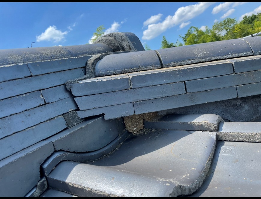 右の写真:漆喰が取れており、雨の入水経路があった。 下の漆喰に関しては、放置しておくと中の土がどんどん取れていき、土台が崩れ、棟崩れが起こる可能性があるので要注意です。