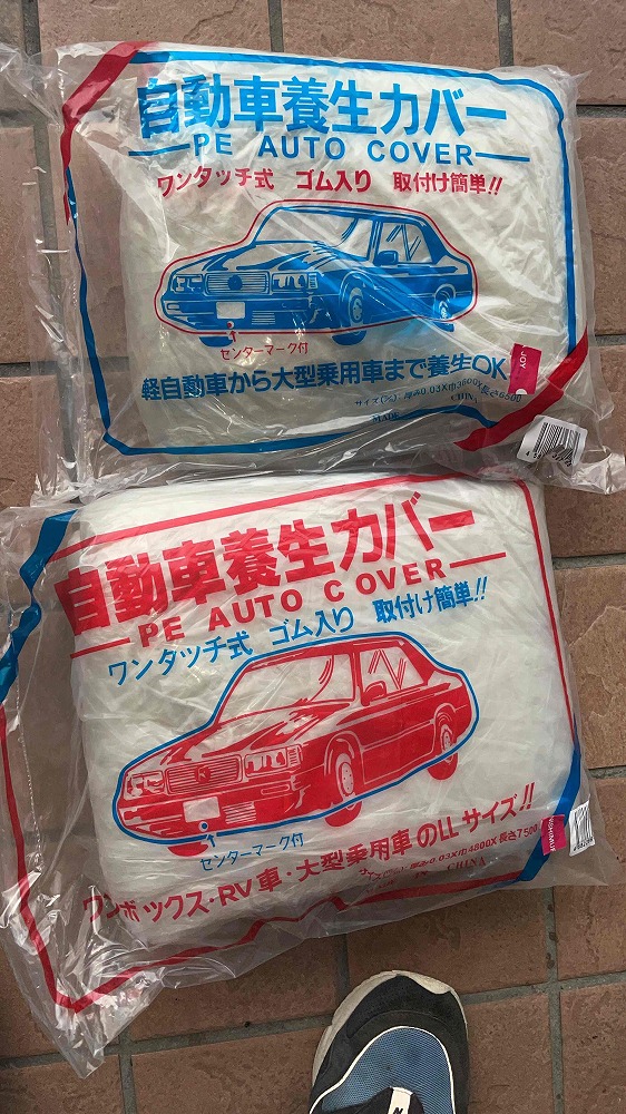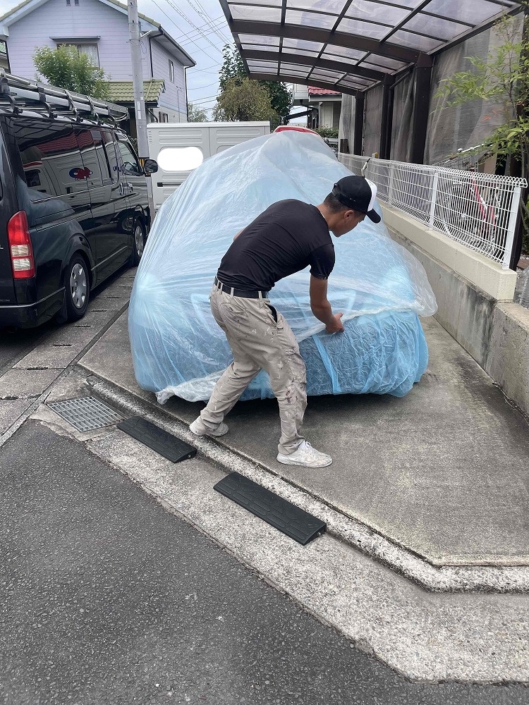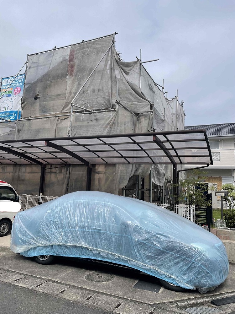 高圧洗浄時の水が車にかかる恐れがあるので数台は移動していただき、移動できなかった1台はカーシートを2枚重ねでかけさせていただきました。