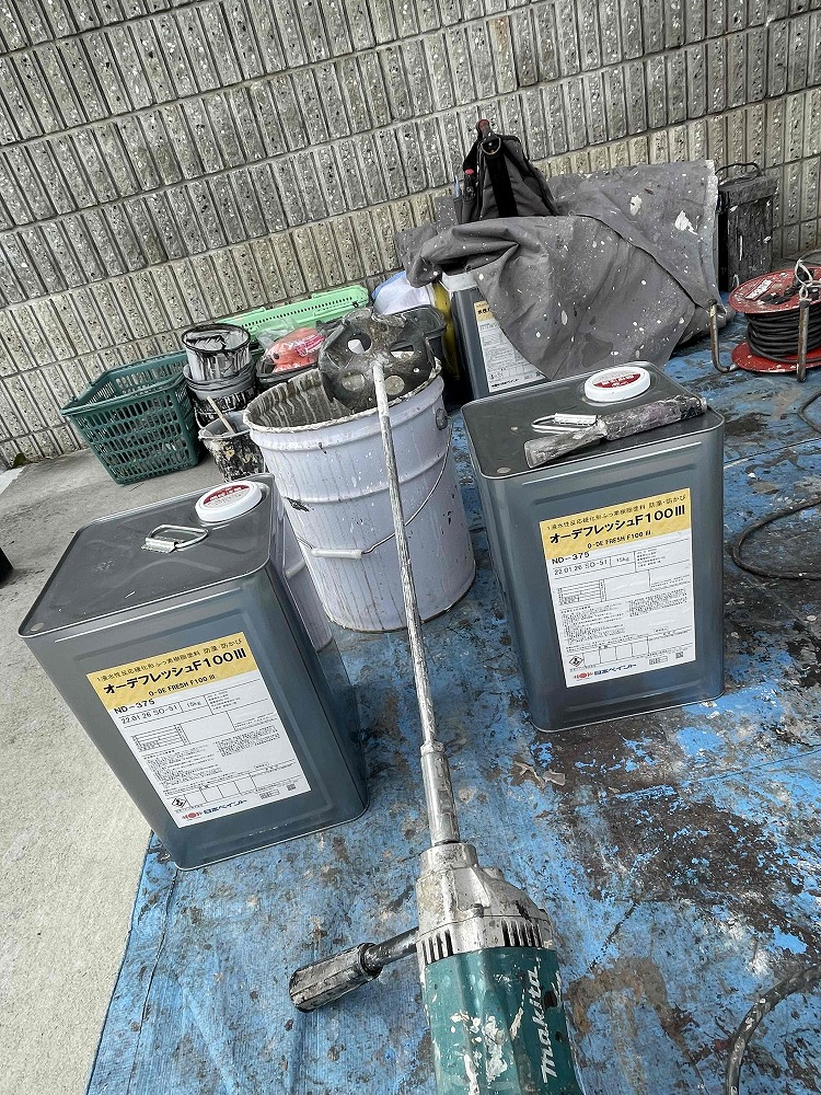 昨日下塗りが終わっており、本日はフッ素での中塗り工事を行っております。