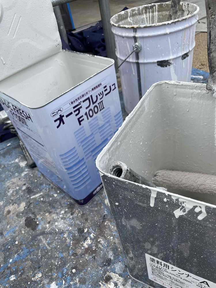 こちらの現場は外壁塗装の塗料がフッ素(日本ペイントオーデフレッシュF)となっており、高価ですが長持ちする塗料です。