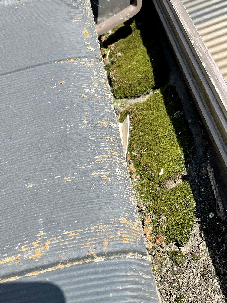 その際屋根に登り隅から隅まで確認したところ、瓦が数枚割れており、雨樋の中は苔まみれで重くなり垂れ下がっていました。