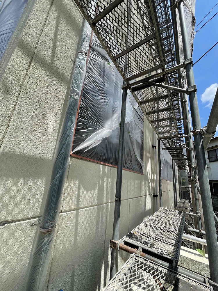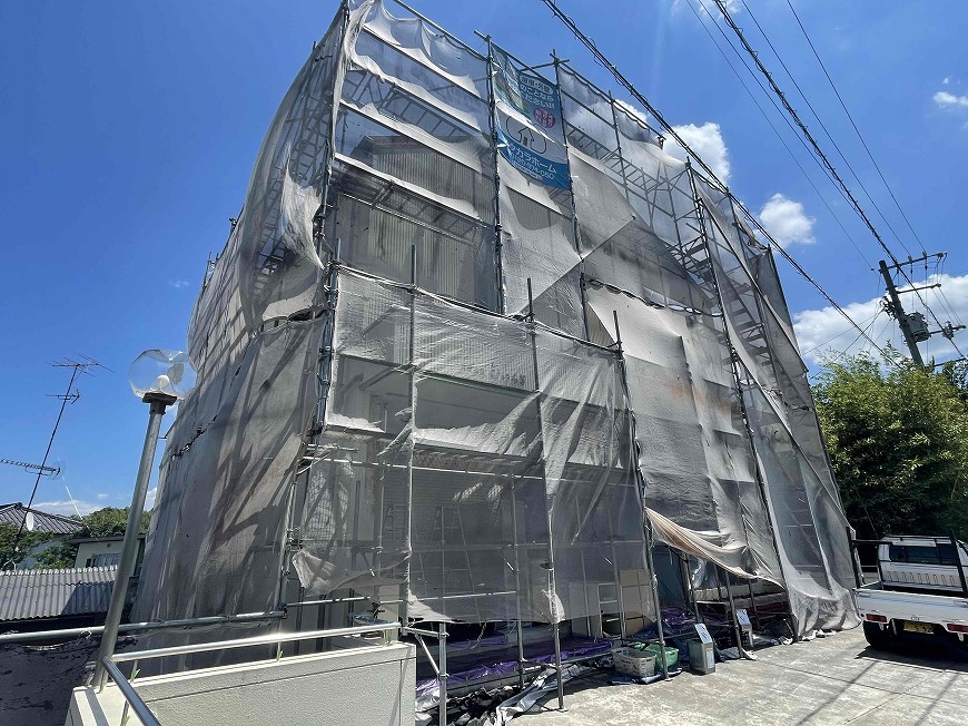 香川県東かがわ市水主にて、屋根・外壁塗装工事の養生作業を行いました。