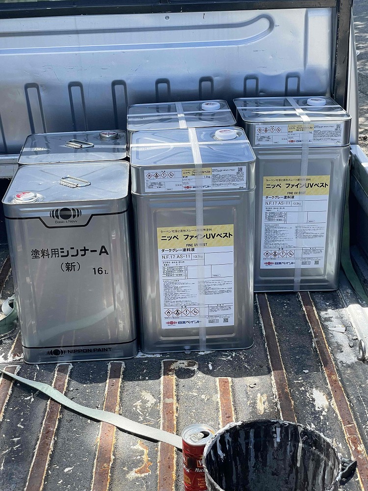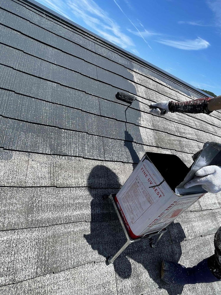 先日屋根塗装の下塗りが終わっており、本日中塗り作業を行いました。