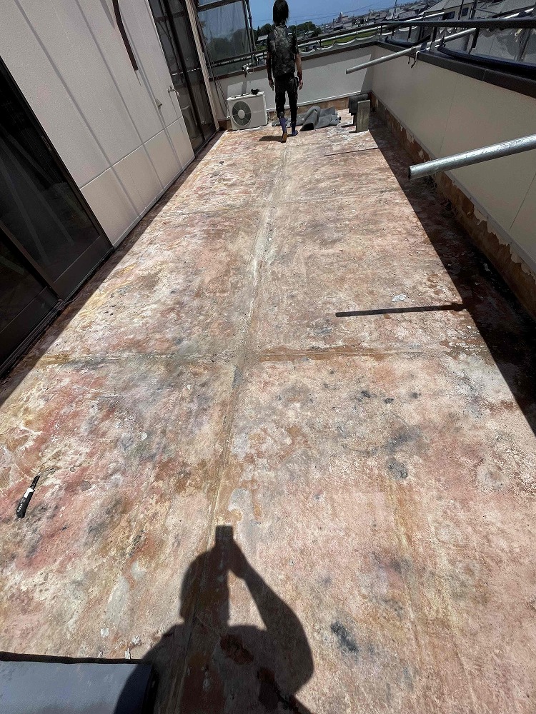 明日より割れているところや隙間があるところを埋めていく下地処理を行い、ウレタン防水工事(3回塗り)を行う流れです。