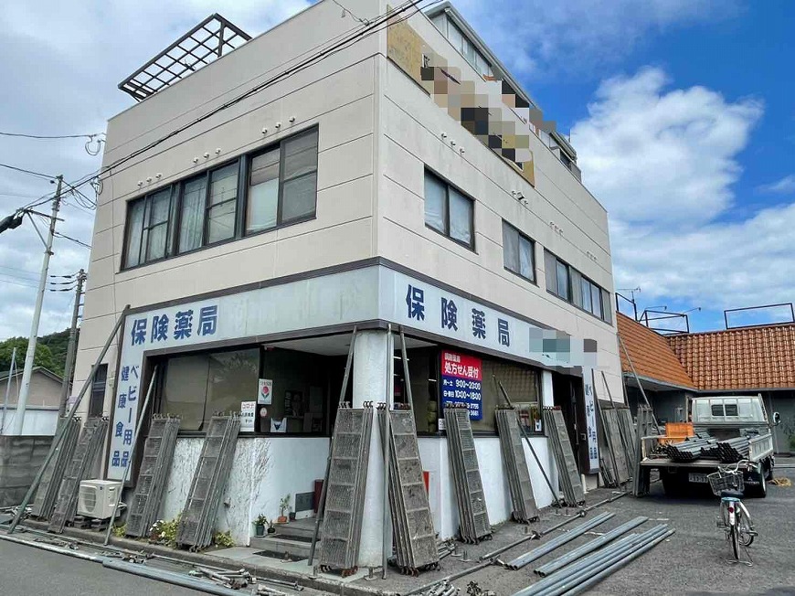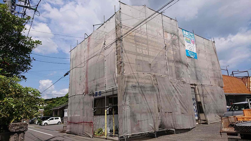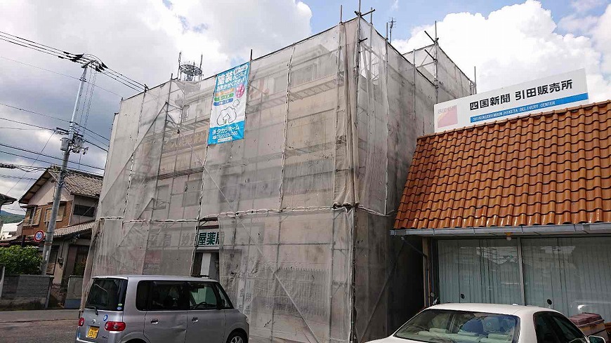 ベランダ防水工事、外壁塗装工事の足場を設置いたしました(香川県東かがわ市引田)