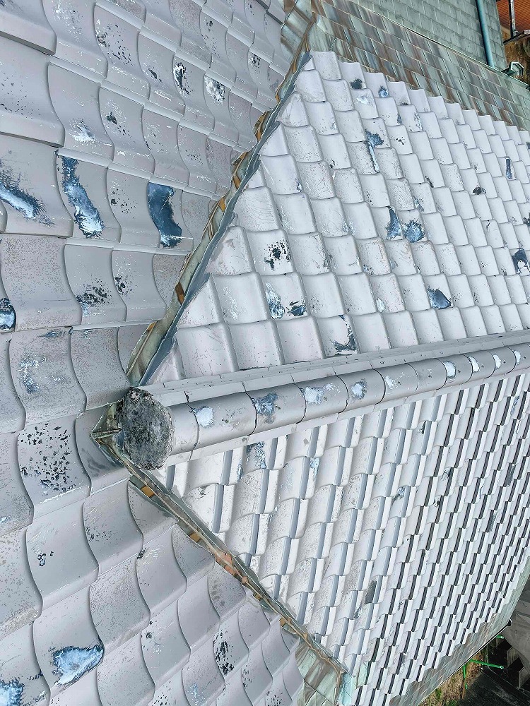 谷の瓦が落ちており隙間が空いており、雨が侵入しやすくなっていたため、瓦を元の位置に戻し固定する工事を行いました。