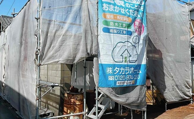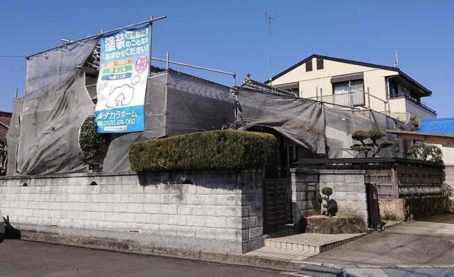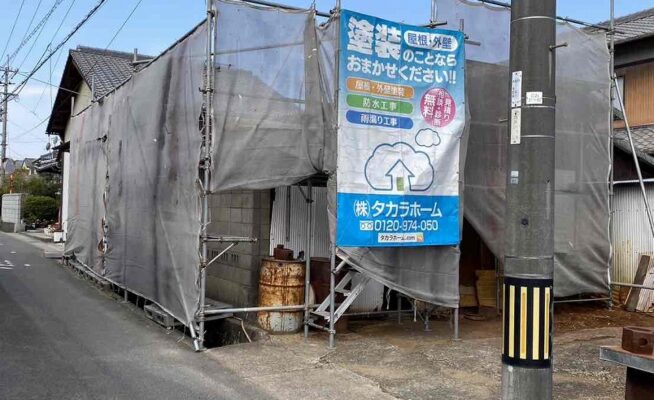香川県さぬき市長尾町I様邸にてスレート屋根のガルバリウム合板のカバー工法工事の足場を設置いたしました!