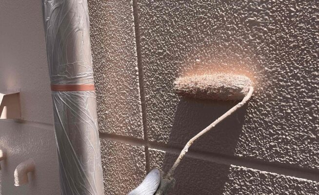 外壁塗装工事の下塗り作業とベランダ防水工事の中塗り作業を行いました(香川県高松市塩上町)