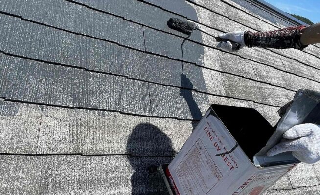 屋根・外壁塗装工事、ベランダ防水工事現場の屋根塗装の中塗り作業(香川県東かがわ市水主)