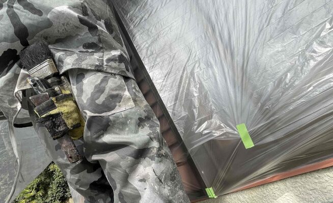 屋根・外壁塗装工事の現場の養生作業を行いました(香川県高松市香川町)