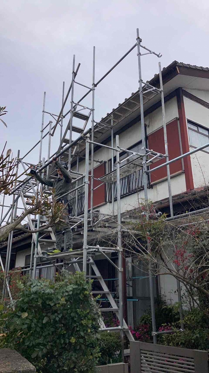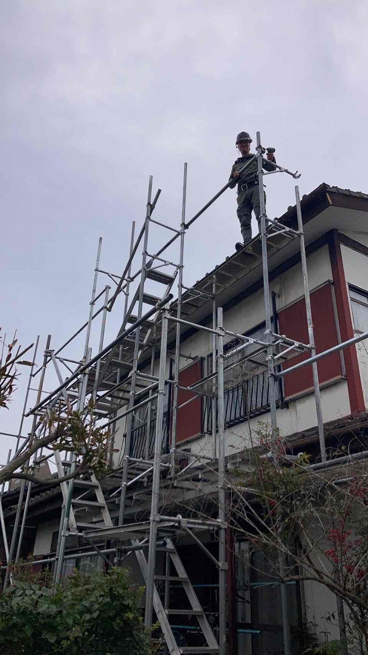 本日、瓦葺き替え工事(ケイミューROOGA)を行うための仮設足場を設置いたしました!明日より既存瓦の撤去を行っていく予定となっております。引き続きよろしくお願いいたします!?