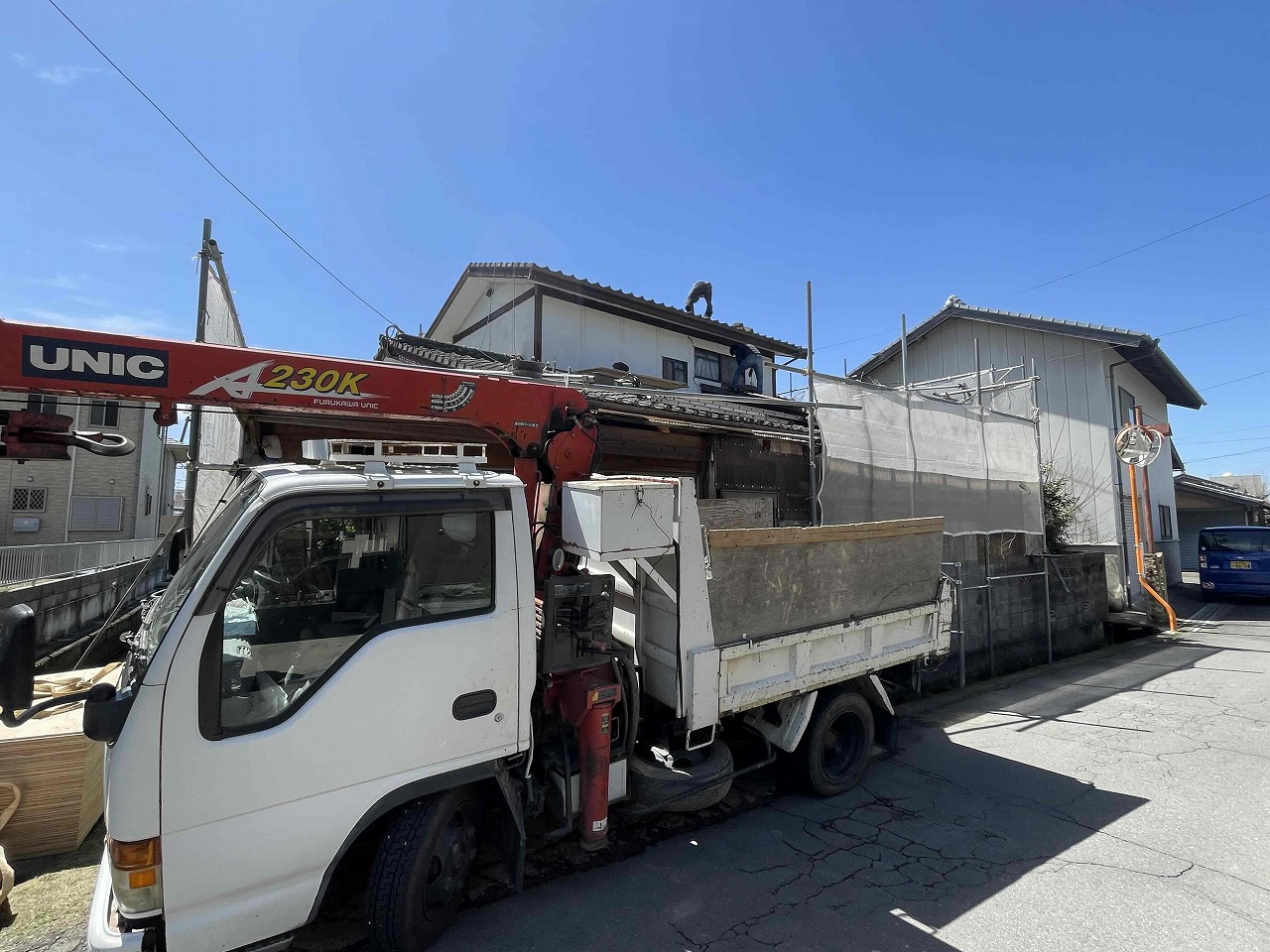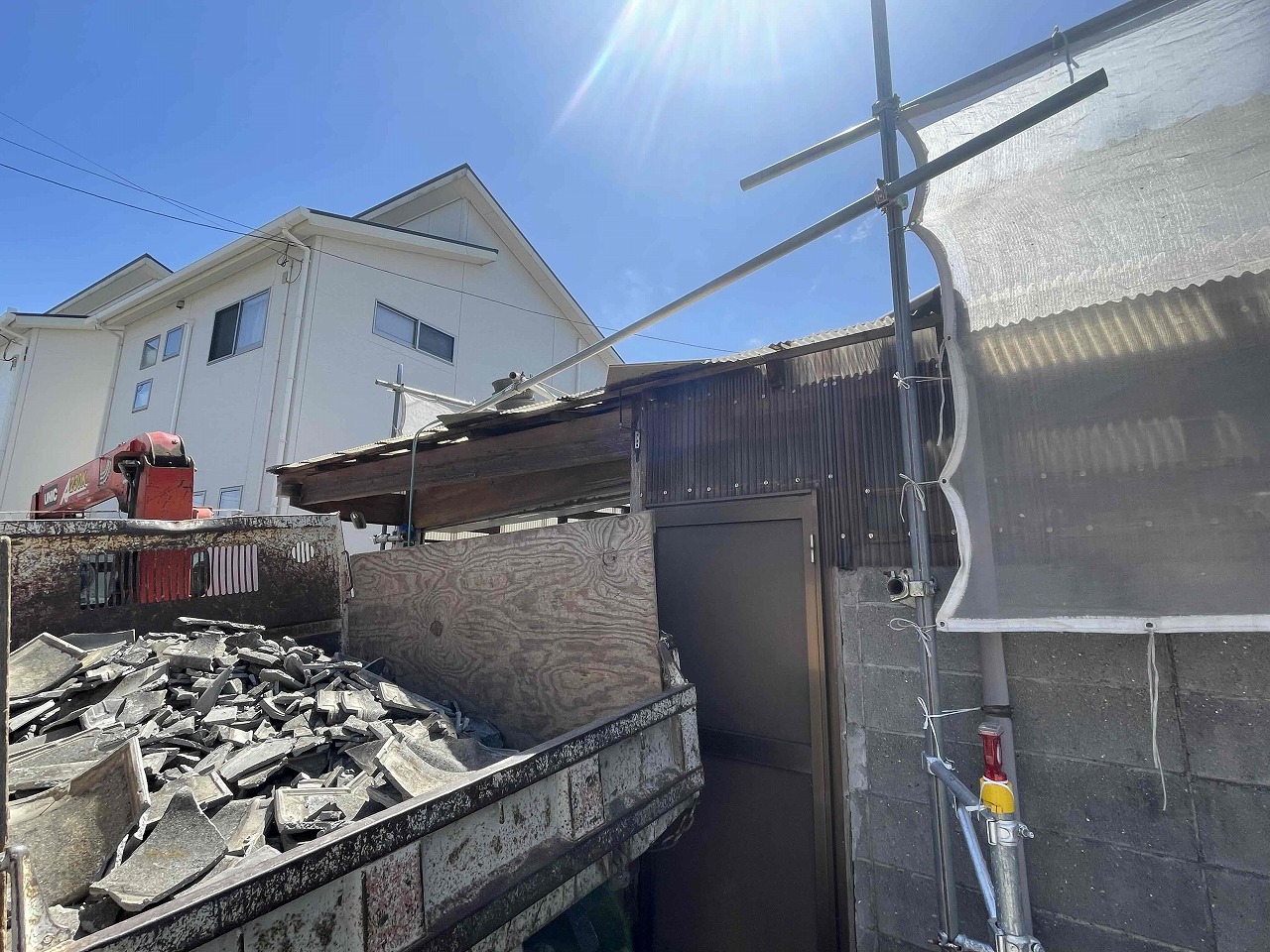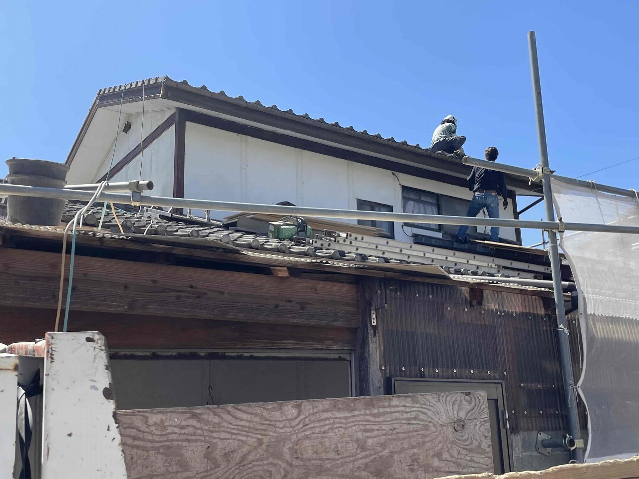 本日、雨漏りしていた既存の瓦の撤去作業を行いました。明日より、下地調整を行い、野地板を張っていく予定となっております。引き続きよろしくお願いいたします!?