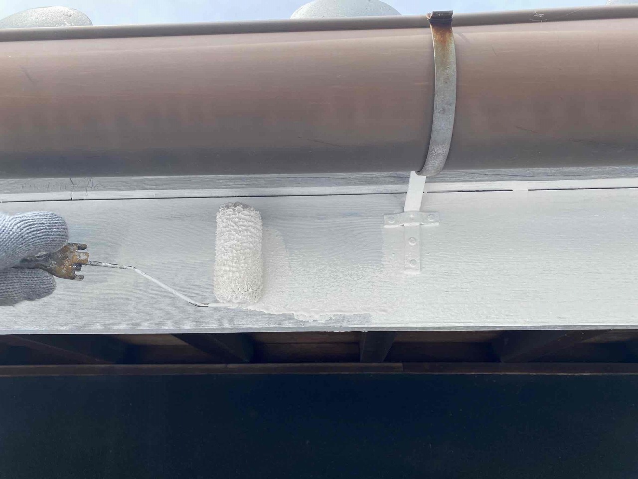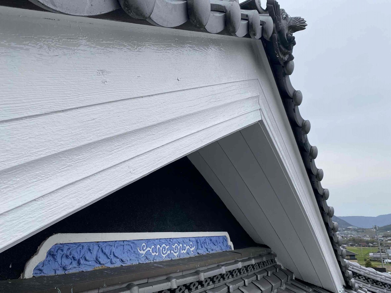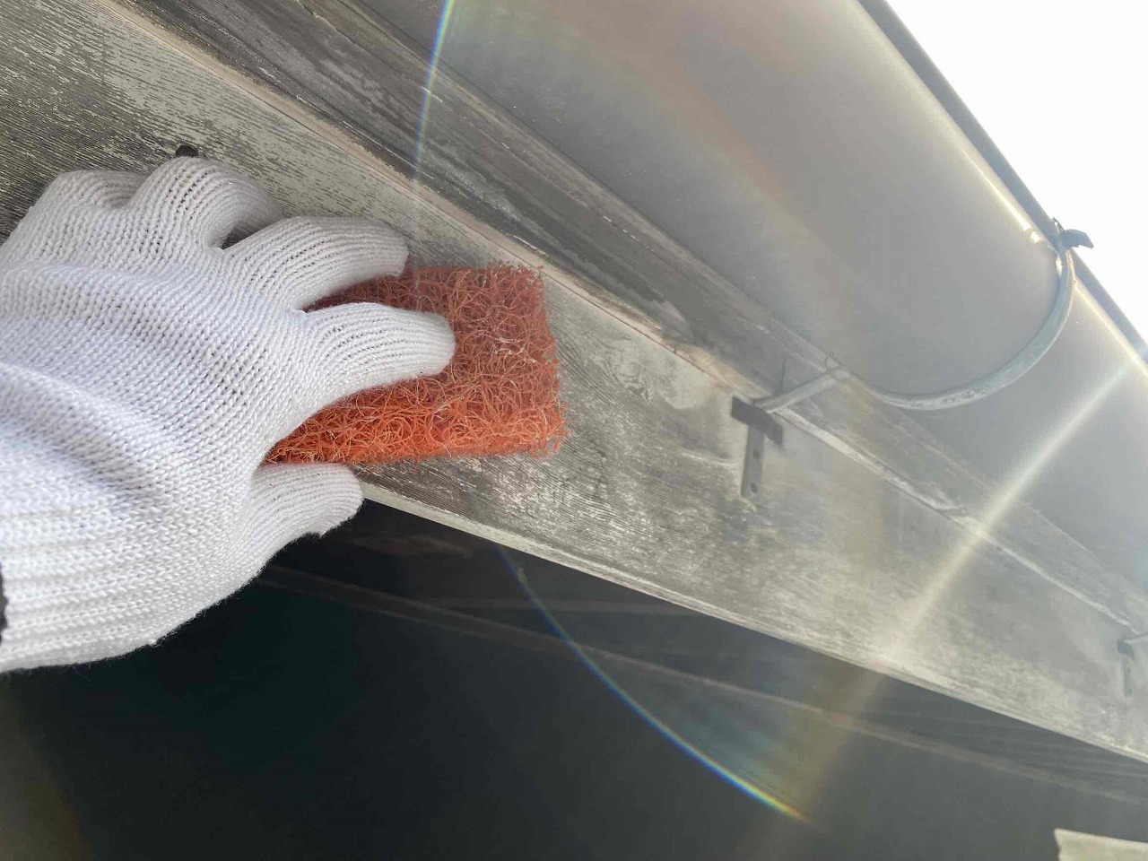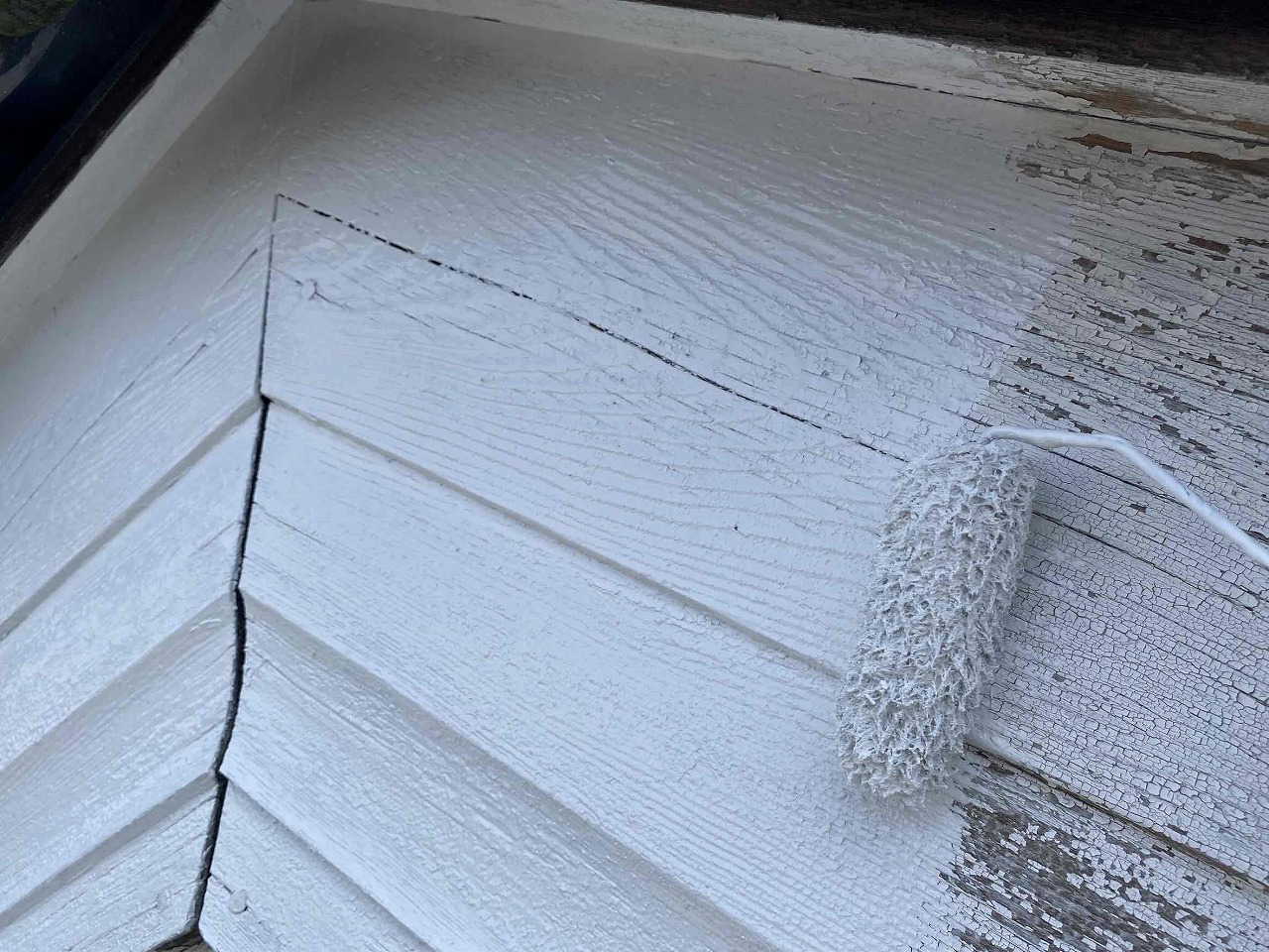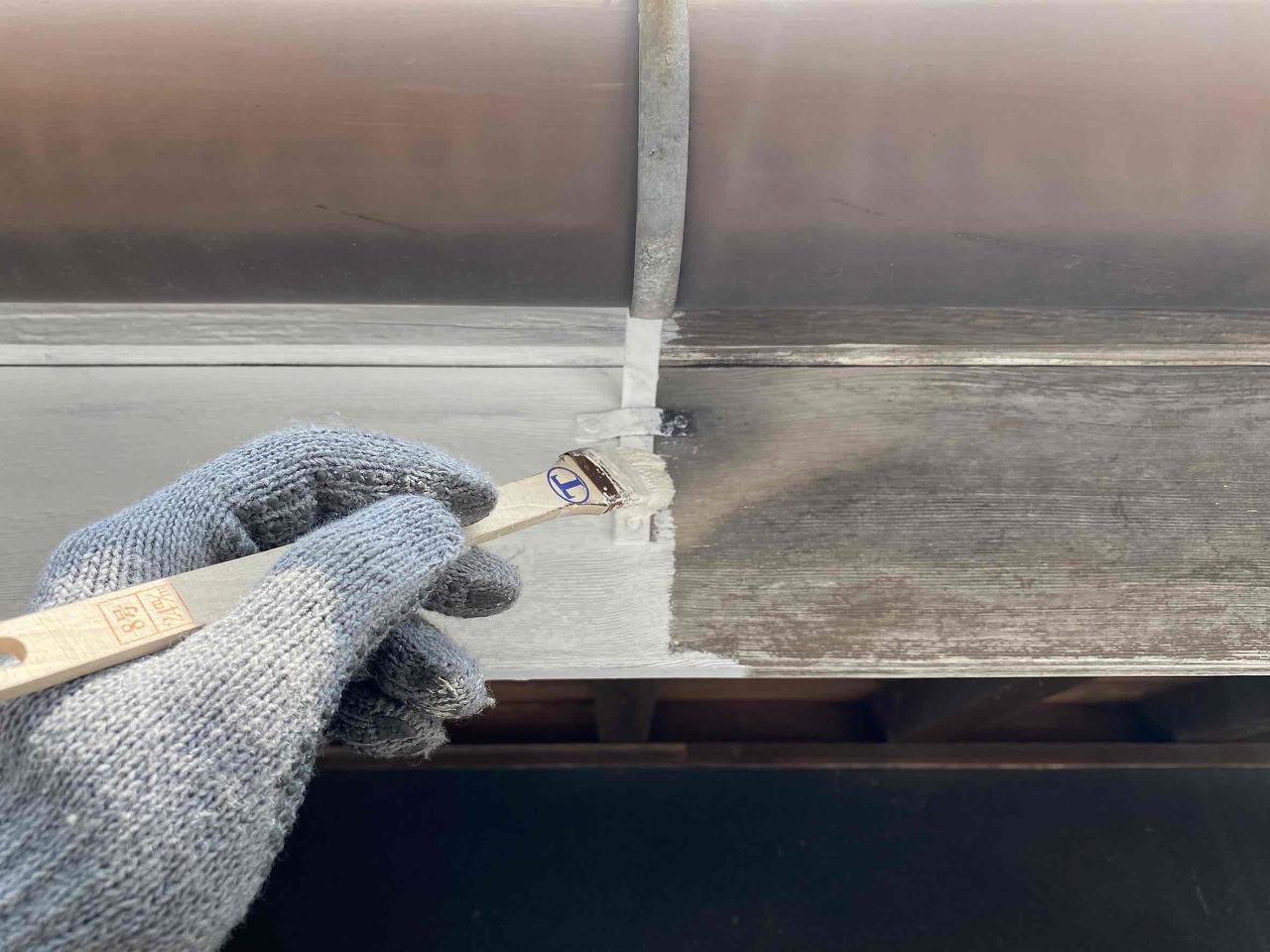 まず最初にケレン作業(下地処理)を行い、木部塗装(鼻隠し)を行い、木部塗装(破風)を行いました。