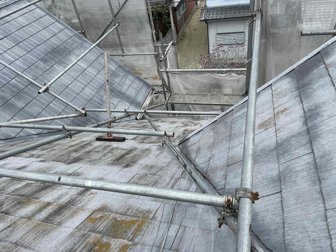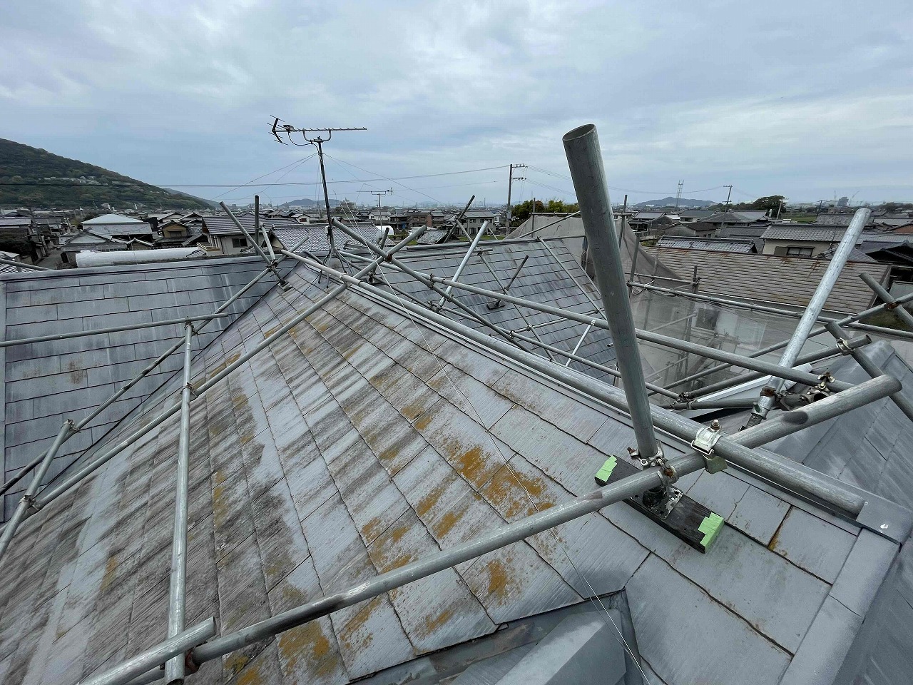 こちらのお客様は、屋根の勾配がかなりあったため、屋根+外壁の足場を組むこととなりました!