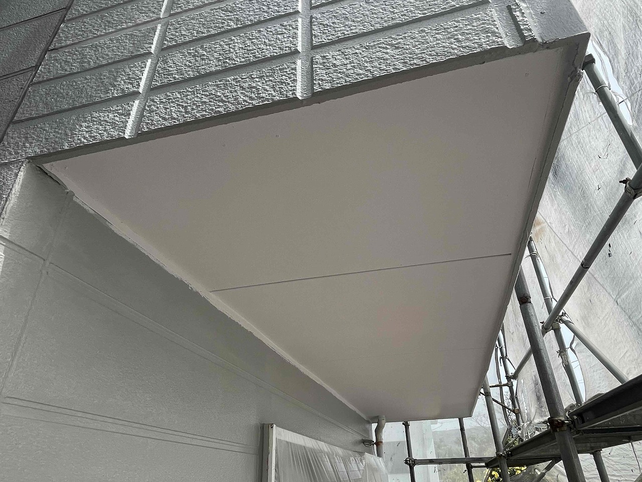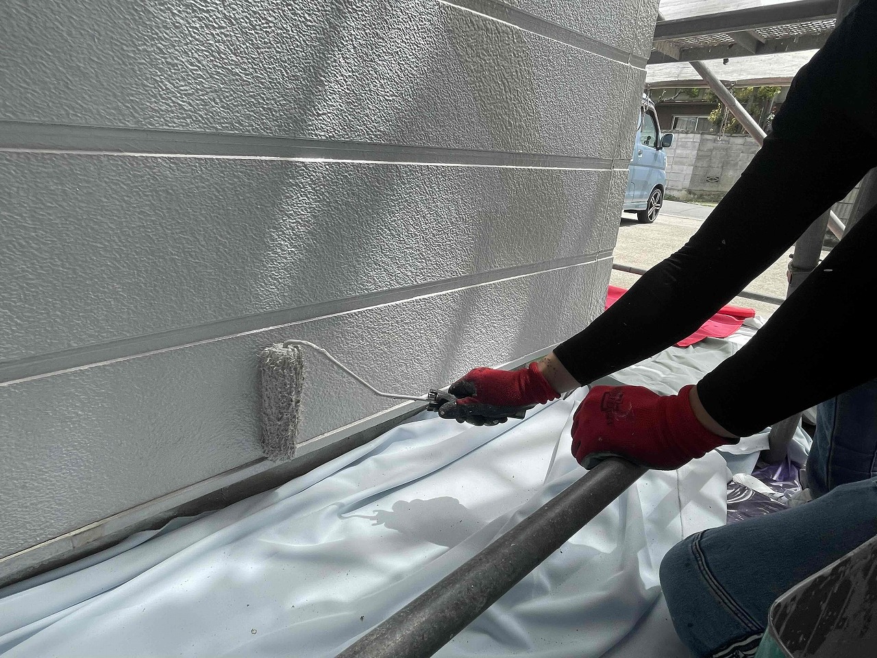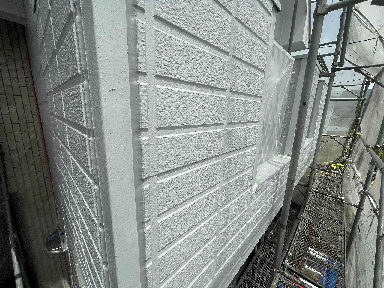 先日、外壁塗装の下塗り(1回目塗装)が完了し、本日、中塗り(2回目塗装)を行いました。後日、上塗り(3回目塗装)を行っていく予定となっております。