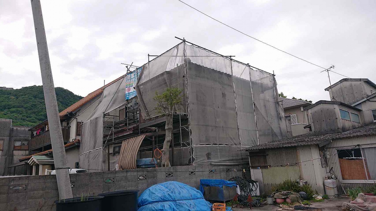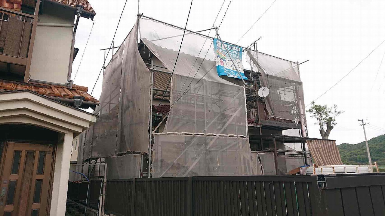 香川県高松市屋島東町にて雨漏り工事・外壁塗装のための足場を設置いたしました!
