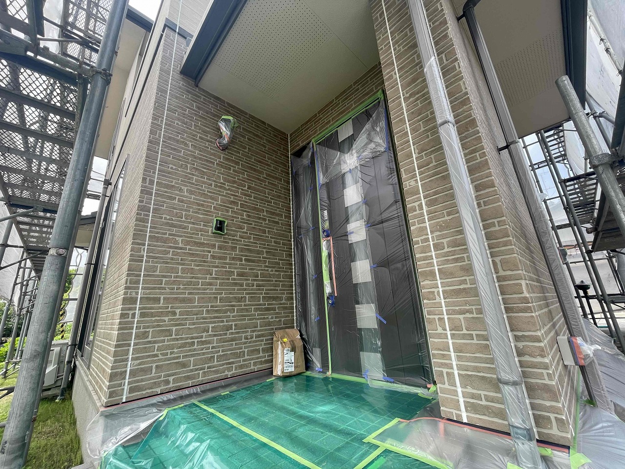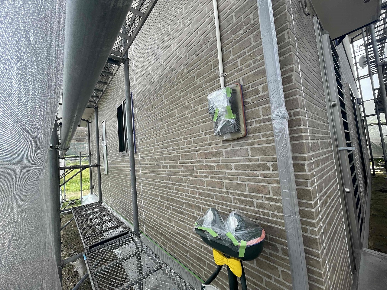 午前中に屋根の下塗り(1回目塗装)が完了し、本日は屋根の中塗り(2回目塗装)は行えないため、外壁塗装前の養生作業を行いました。