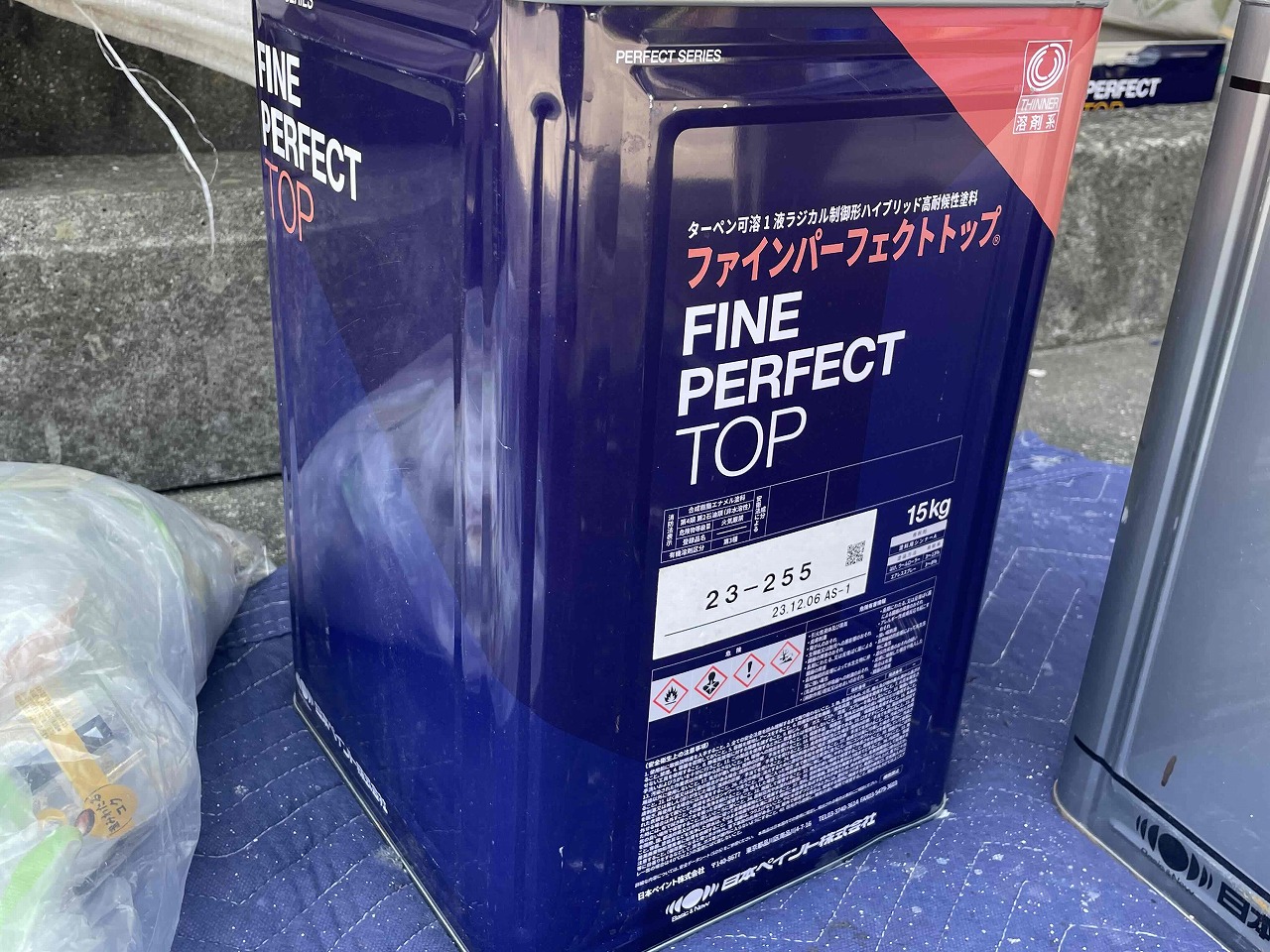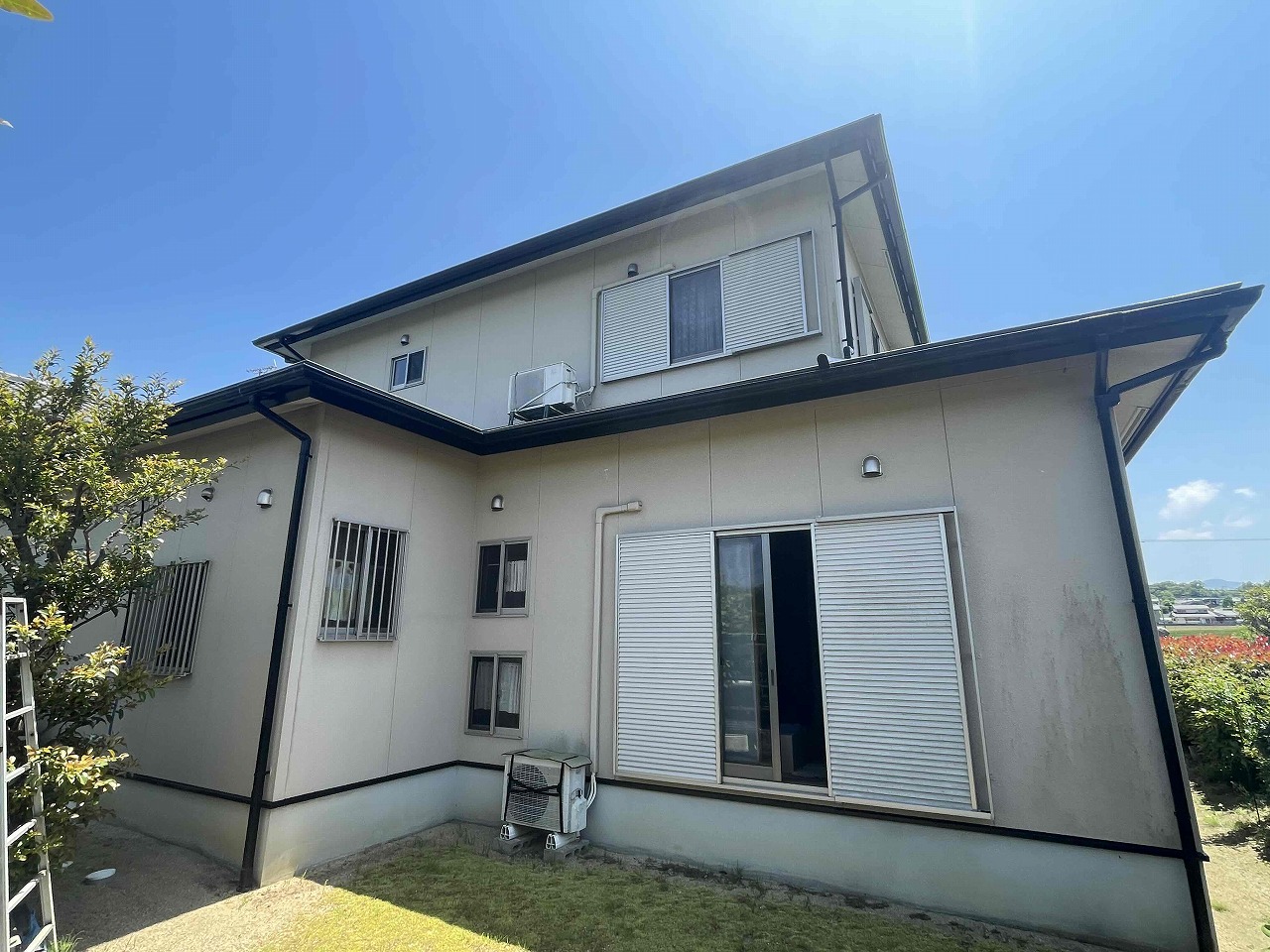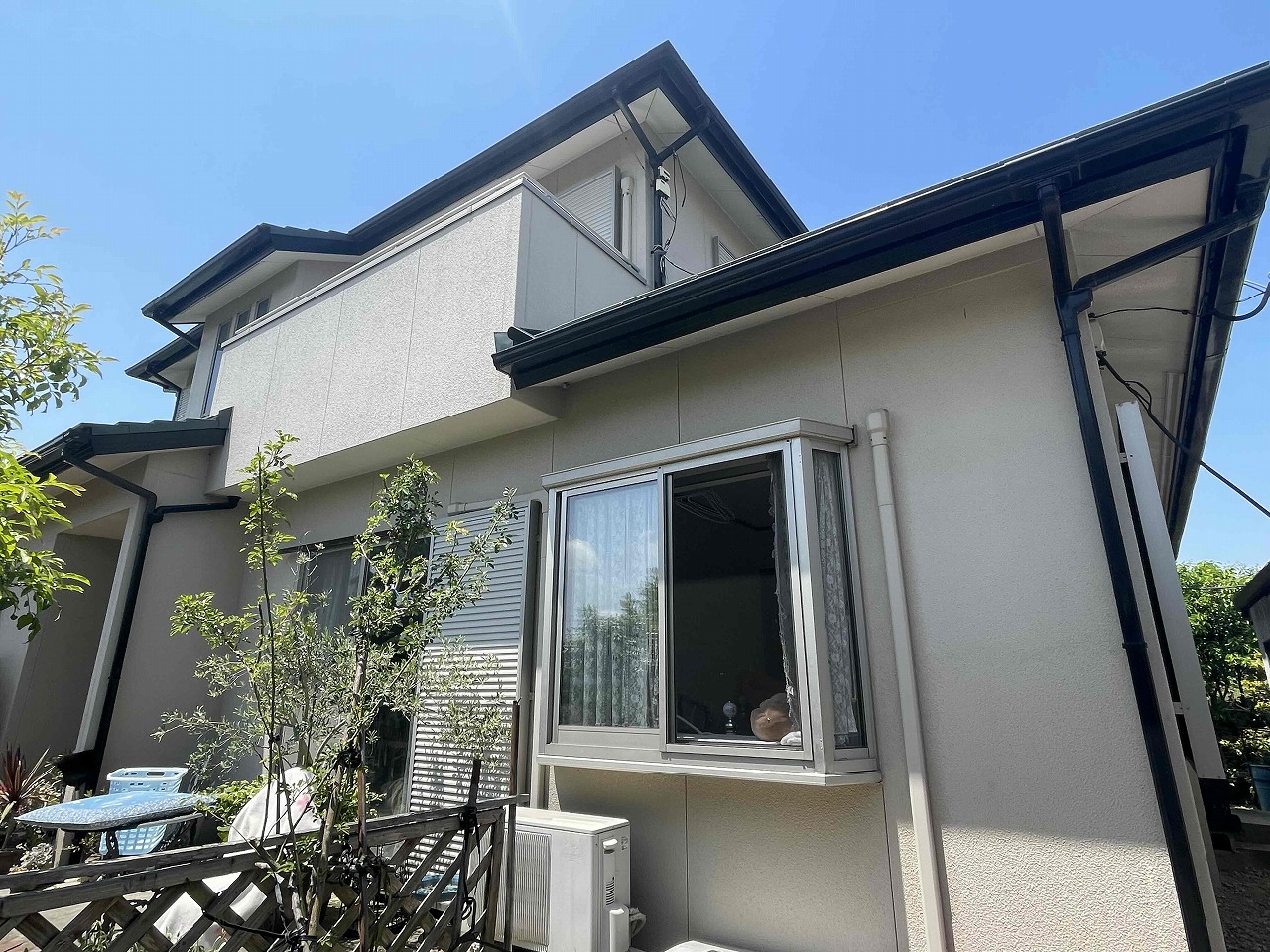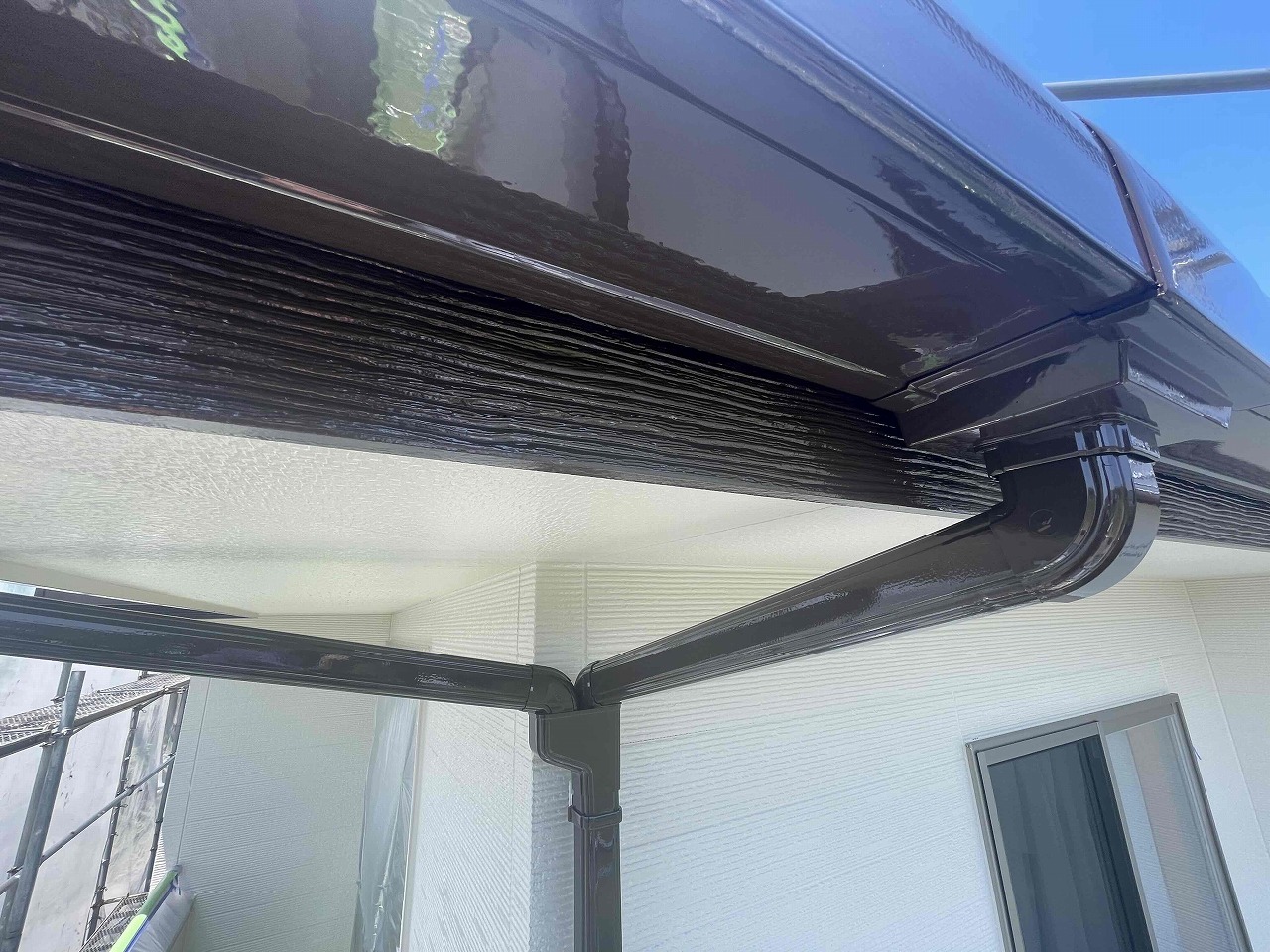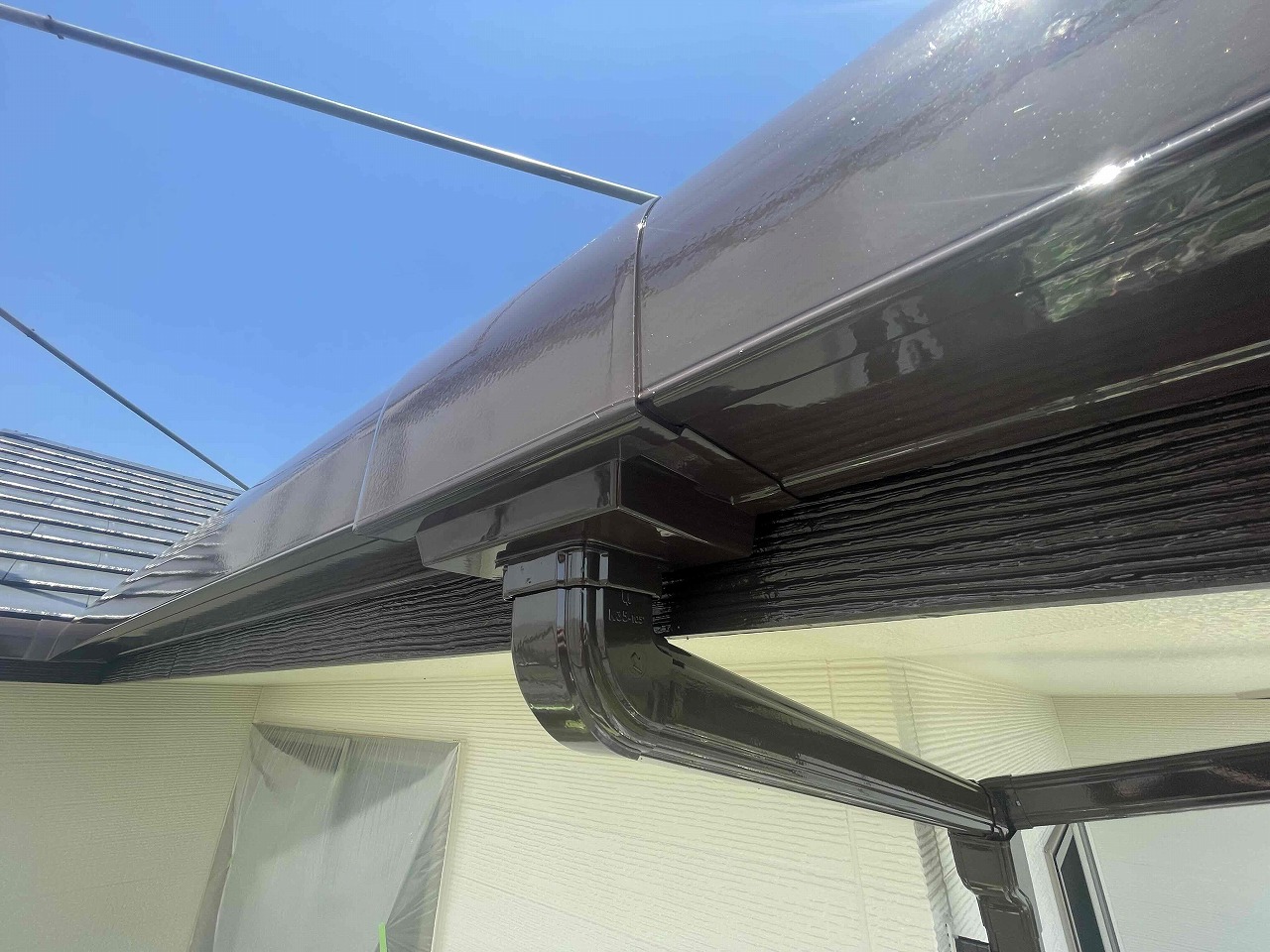 先日、外壁塗装の上塗り(3回目塗装)が完了しており、本日は付帯部分となる雨樋の塗装を行いました。来週は屋根の上塗り(3回目塗装)を行っていく予定となっております。