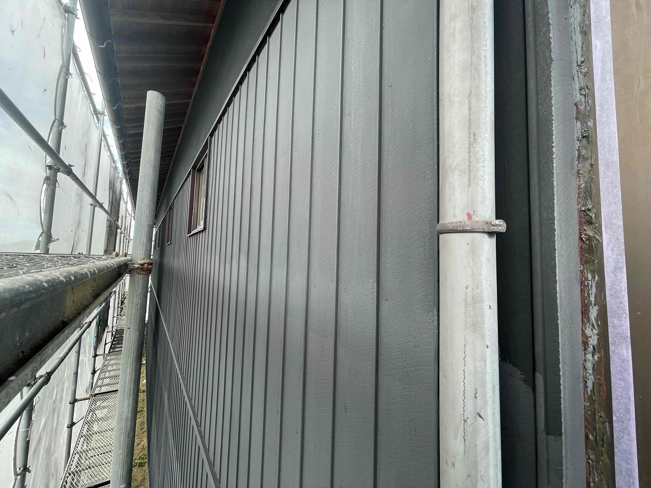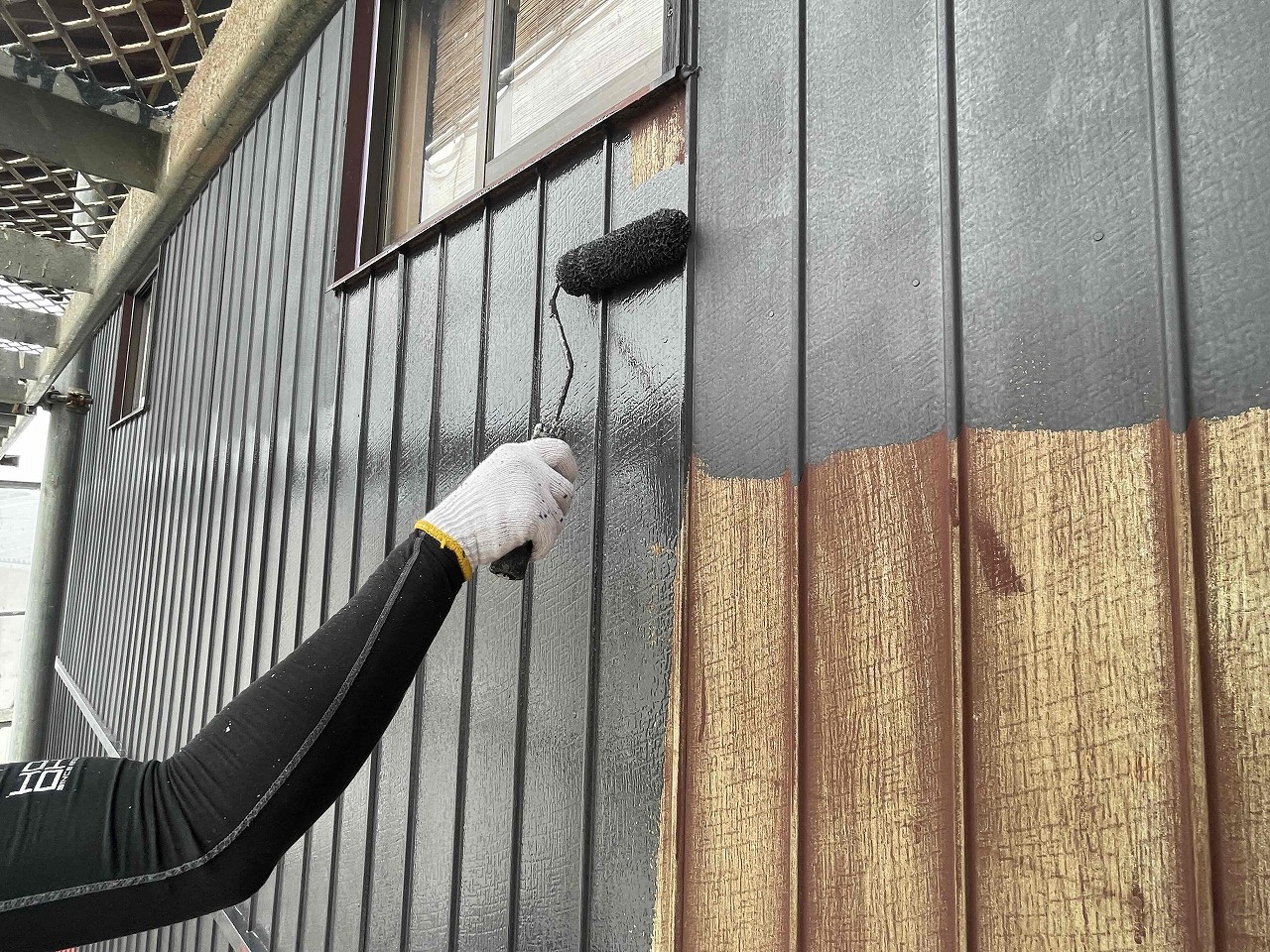 先日、高圧洗浄とケレン作業が完了しており、本日は午前中に養生作業、午後より外壁塗装の錆止めとなる下塗り(1回目塗装)を行いました。明日は中塗り(2回目塗装)を行っていく予定となっております。引き続きよろしくお願いいたします!?