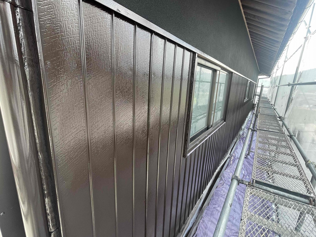 先日、外壁塗装の中塗り(2回目塗装)が完了しており、本日は上塗り(3回目塗装)を行いました。明日は付帯パーツ類の塗装を行っていく予定となっております。引き続きよろしくお願いいたします!?