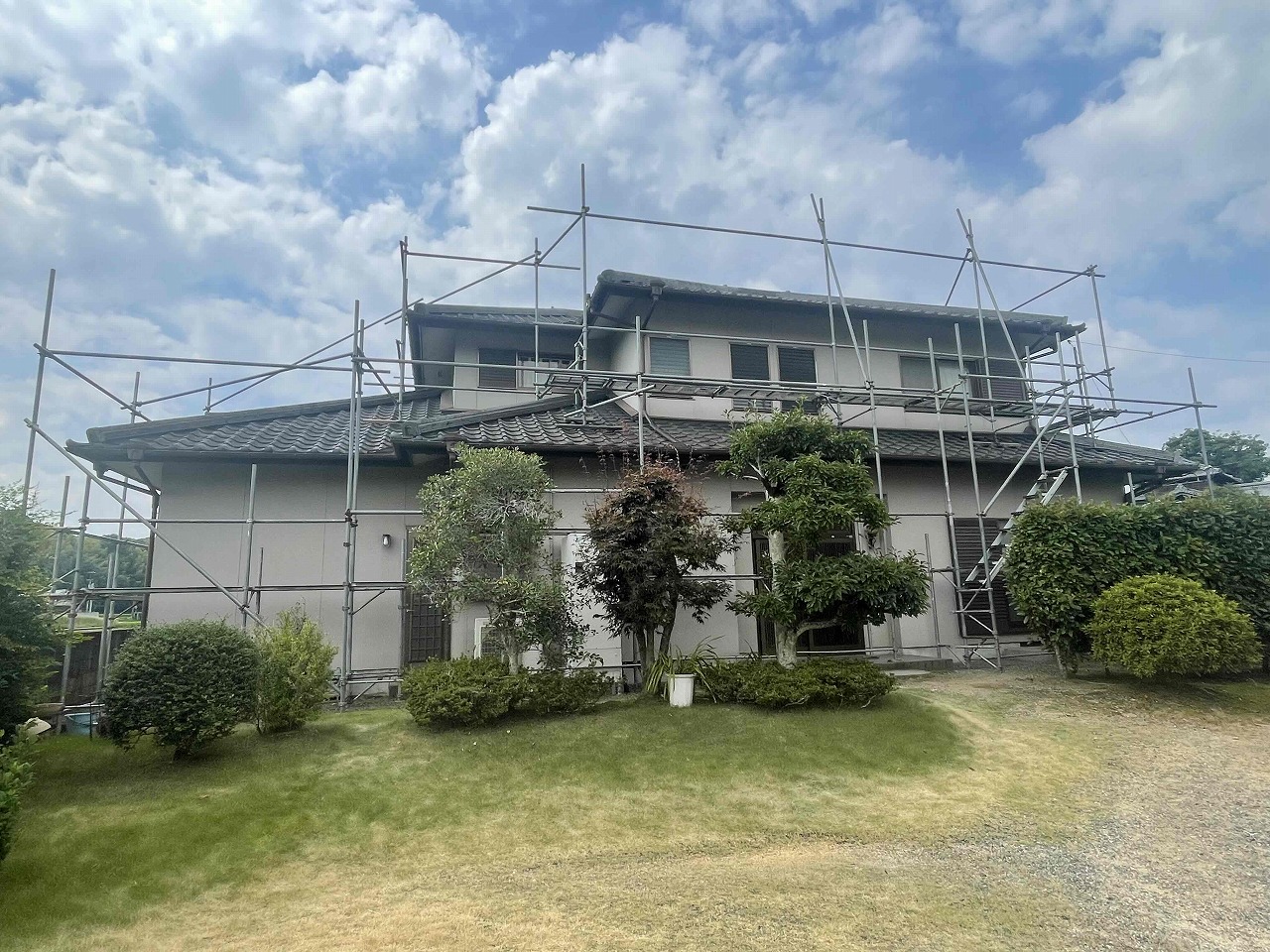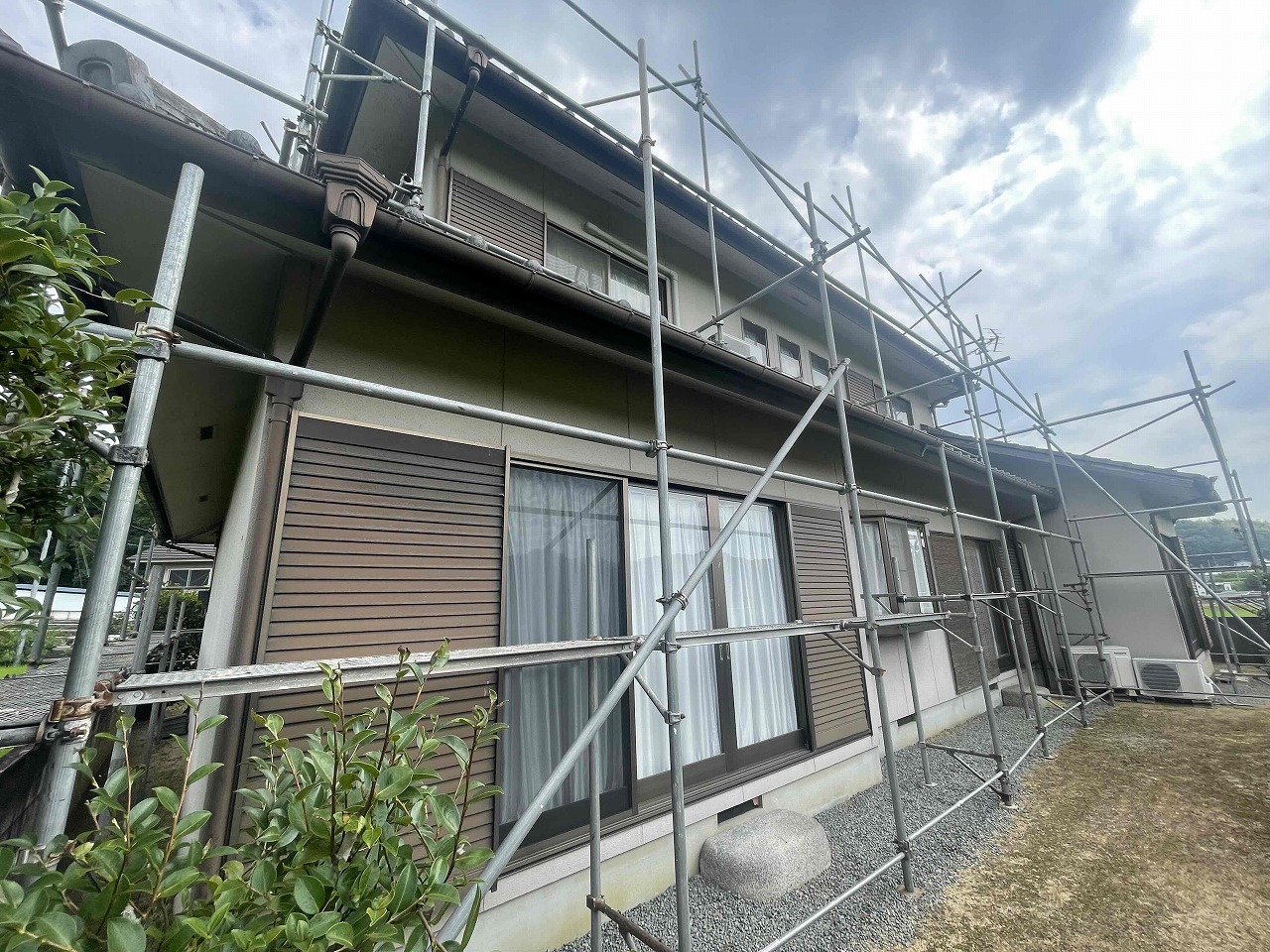 本日は仮設足場を設置し、来週より屋根・外壁塗装を行っていく予定となっております。