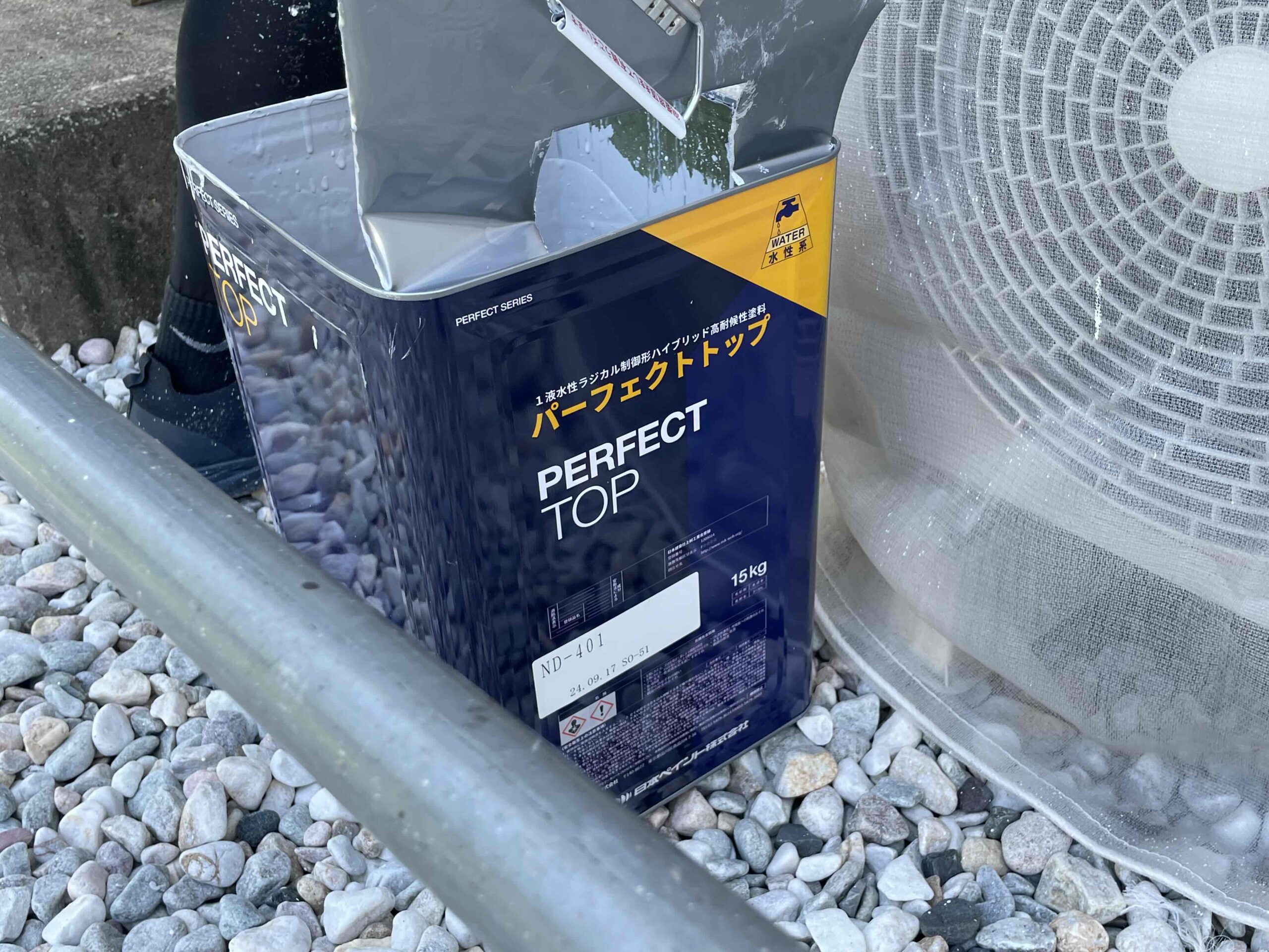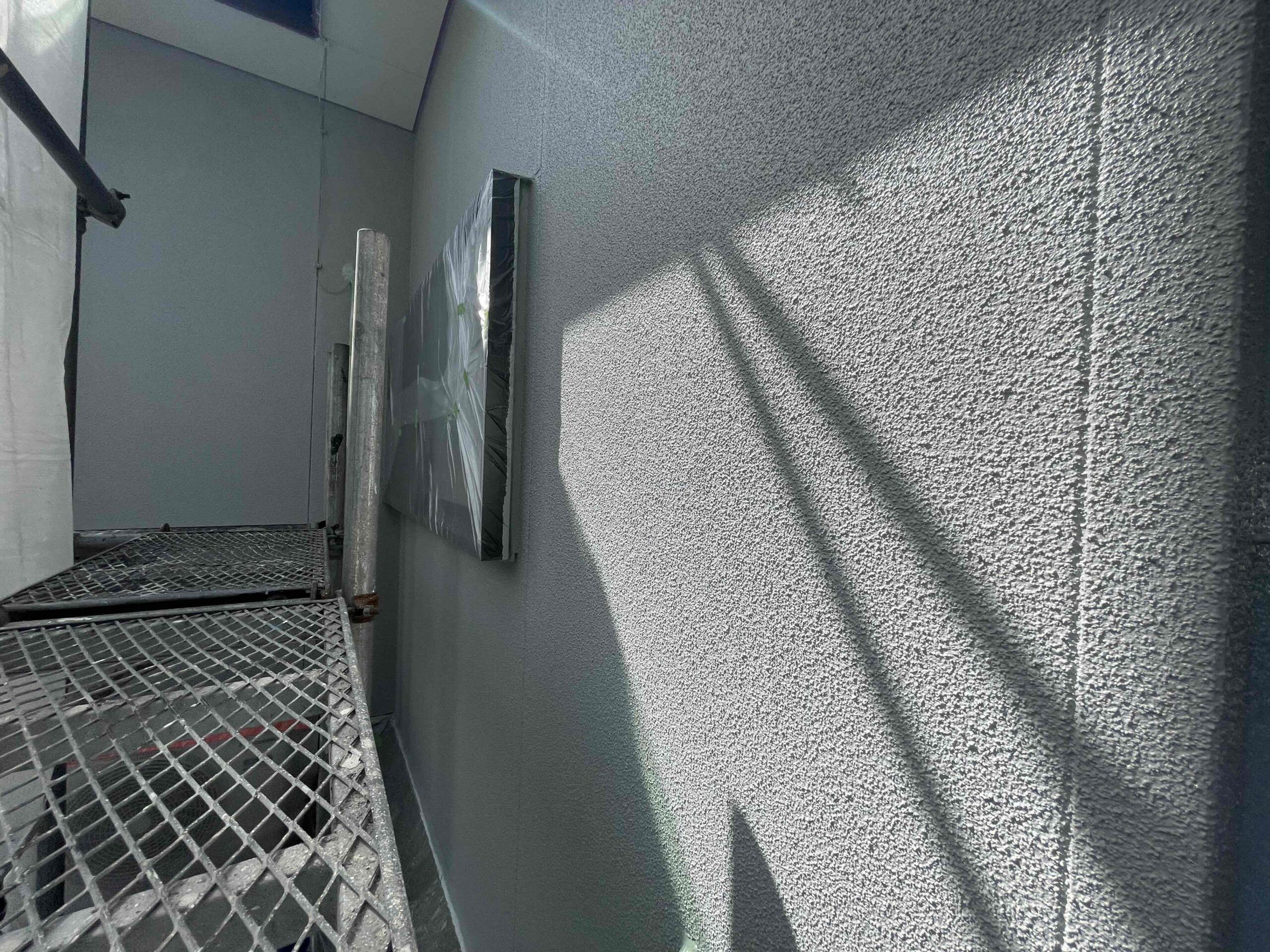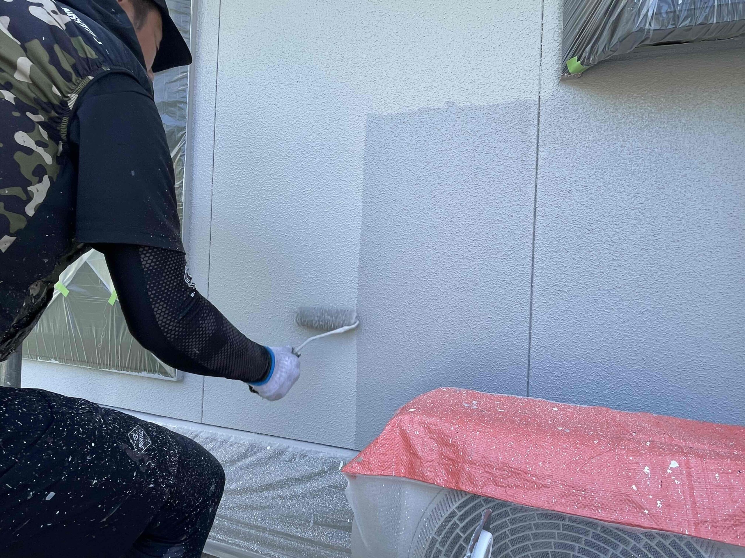 先日、外壁塗装の下塗り(1回目塗装)が完了しており、本日は中塗り(2回目塗装)を行いました。明日は上塗り(3回目塗装)を行っていく予定となっております。引き続きよろしくお願いいたします!?