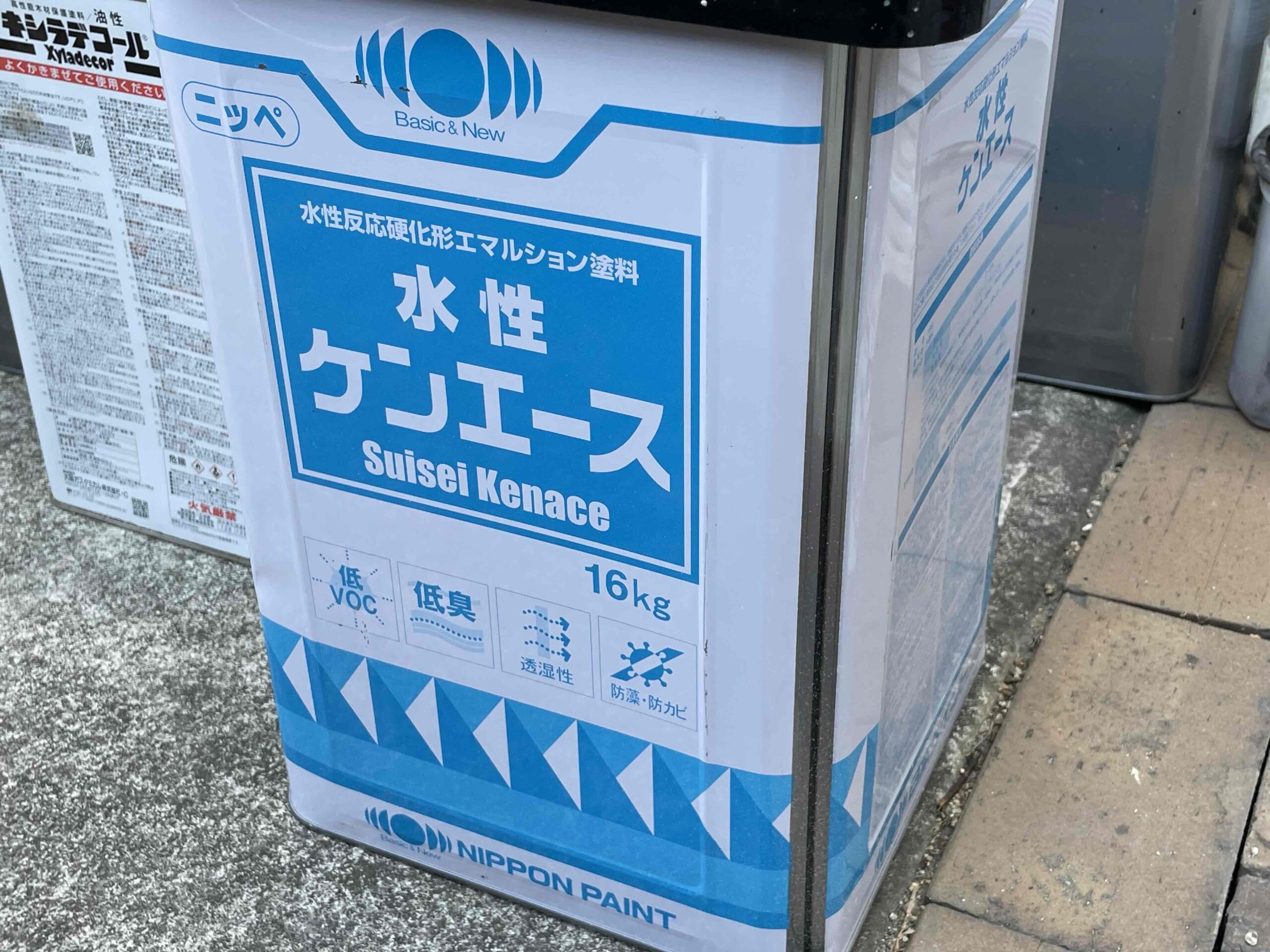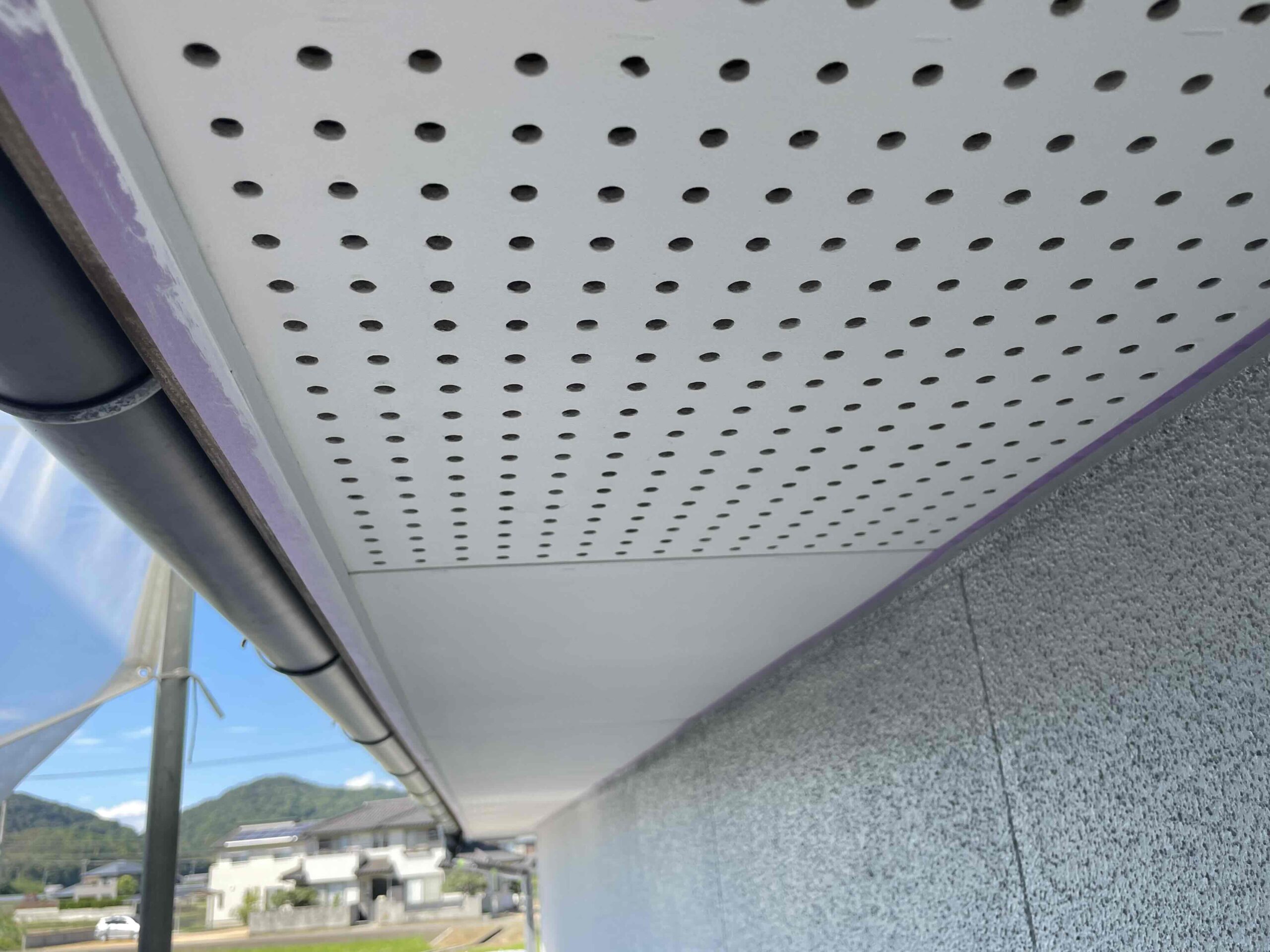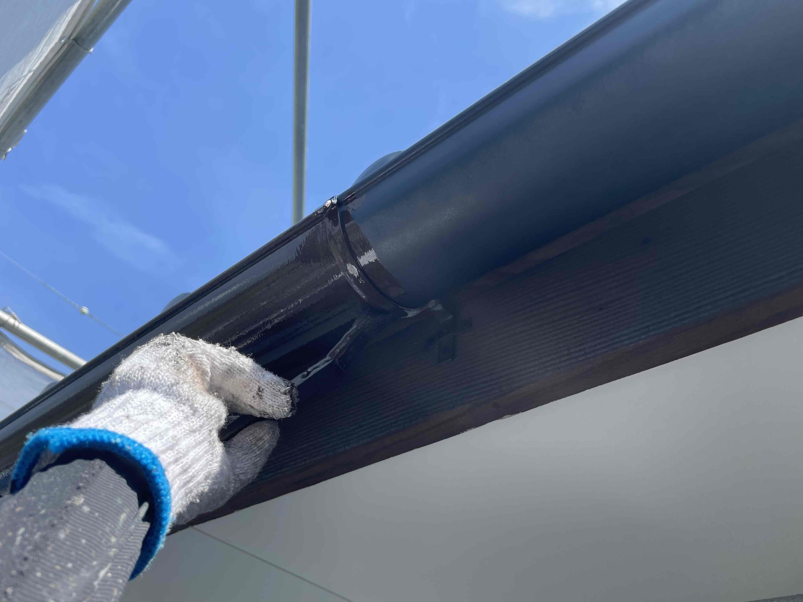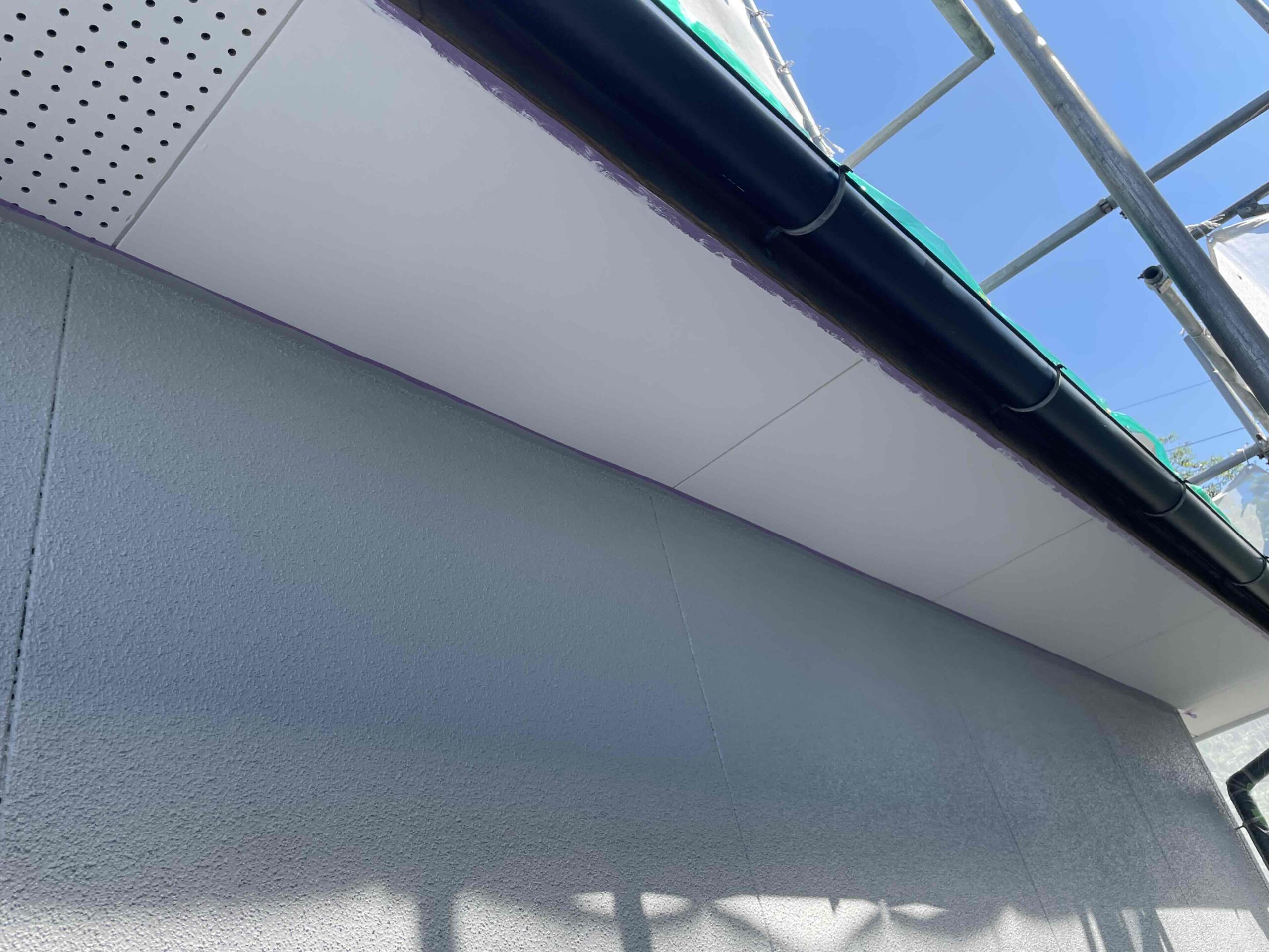 先日、外壁塗装の上塗り(3回目塗装)が完了しており、本日は午前中に軒天塗装の手直し、午後は雨樋塗装を行いました。