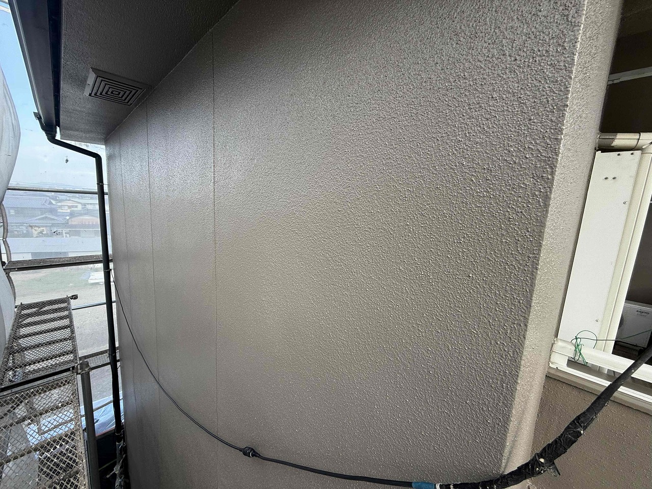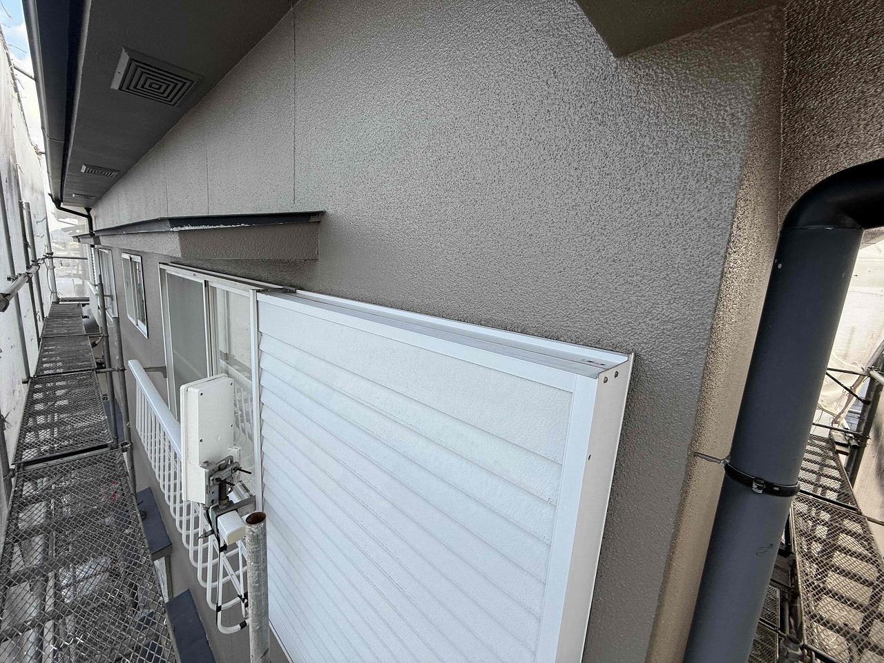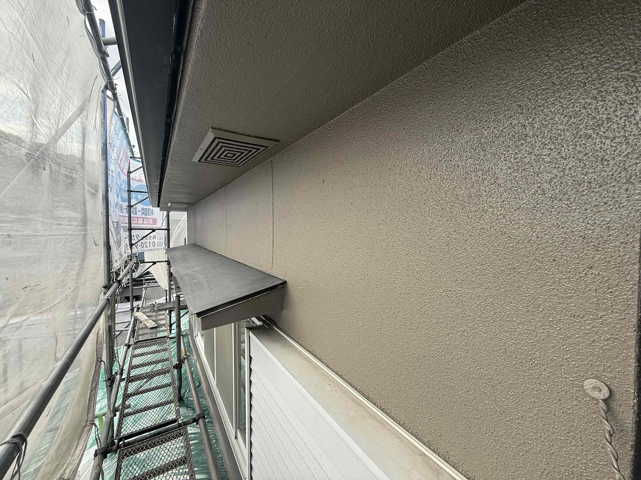 先日、中塗り(2回目塗装)が完了しており、本日はローラーで塗装できない部分を専用のハケを使って丁寧に塗装していきました。午後より上塗り(3回目塗装)を行いました。