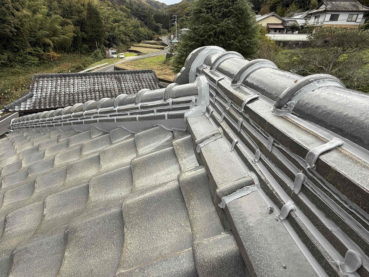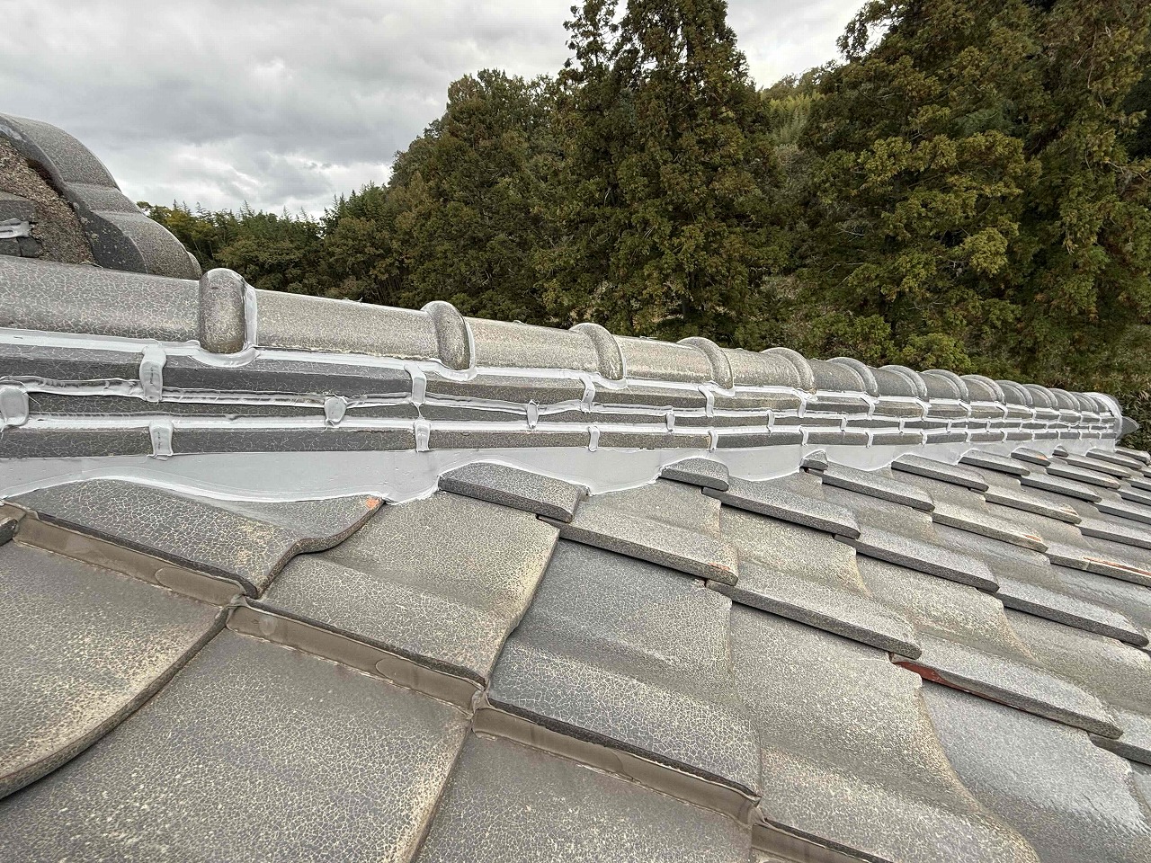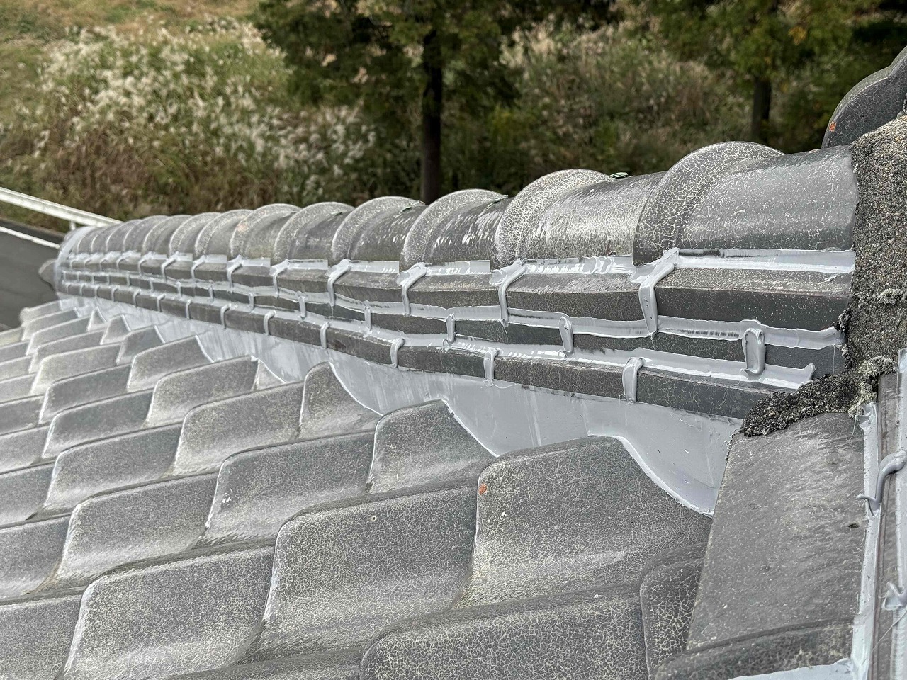 古くなって劣化していた漆喰部分の下地調整を行い、シリコンにて上記の写真のように施工を行いました。こちらの工事をすることにより、雨水の浸入や瓦のズレ防止が期待できます。