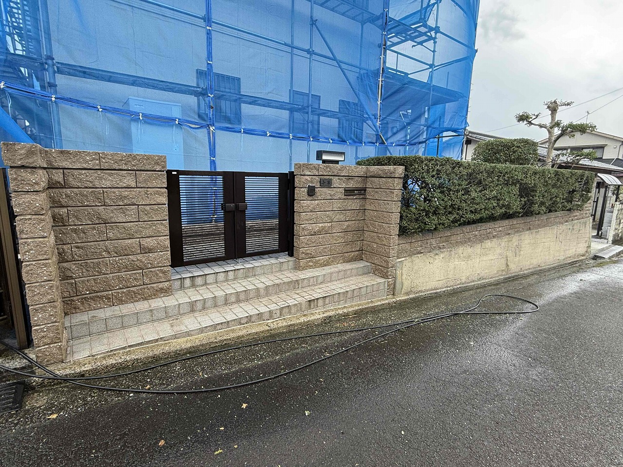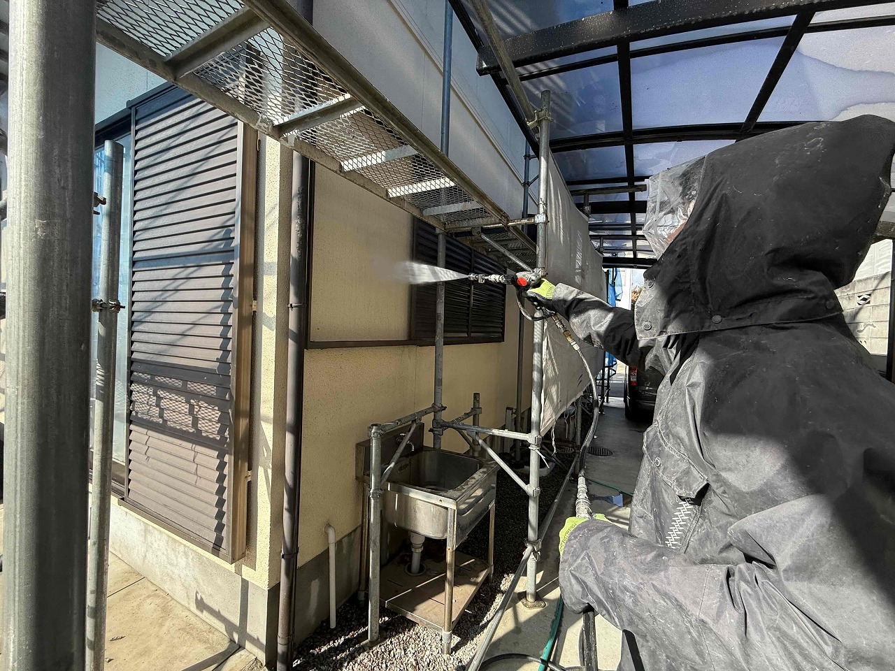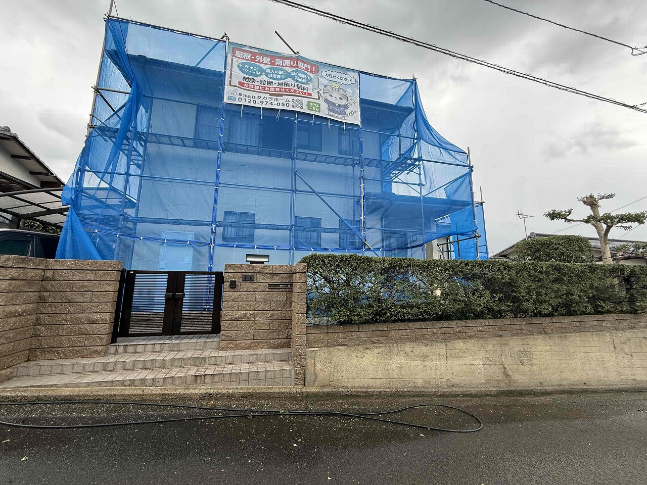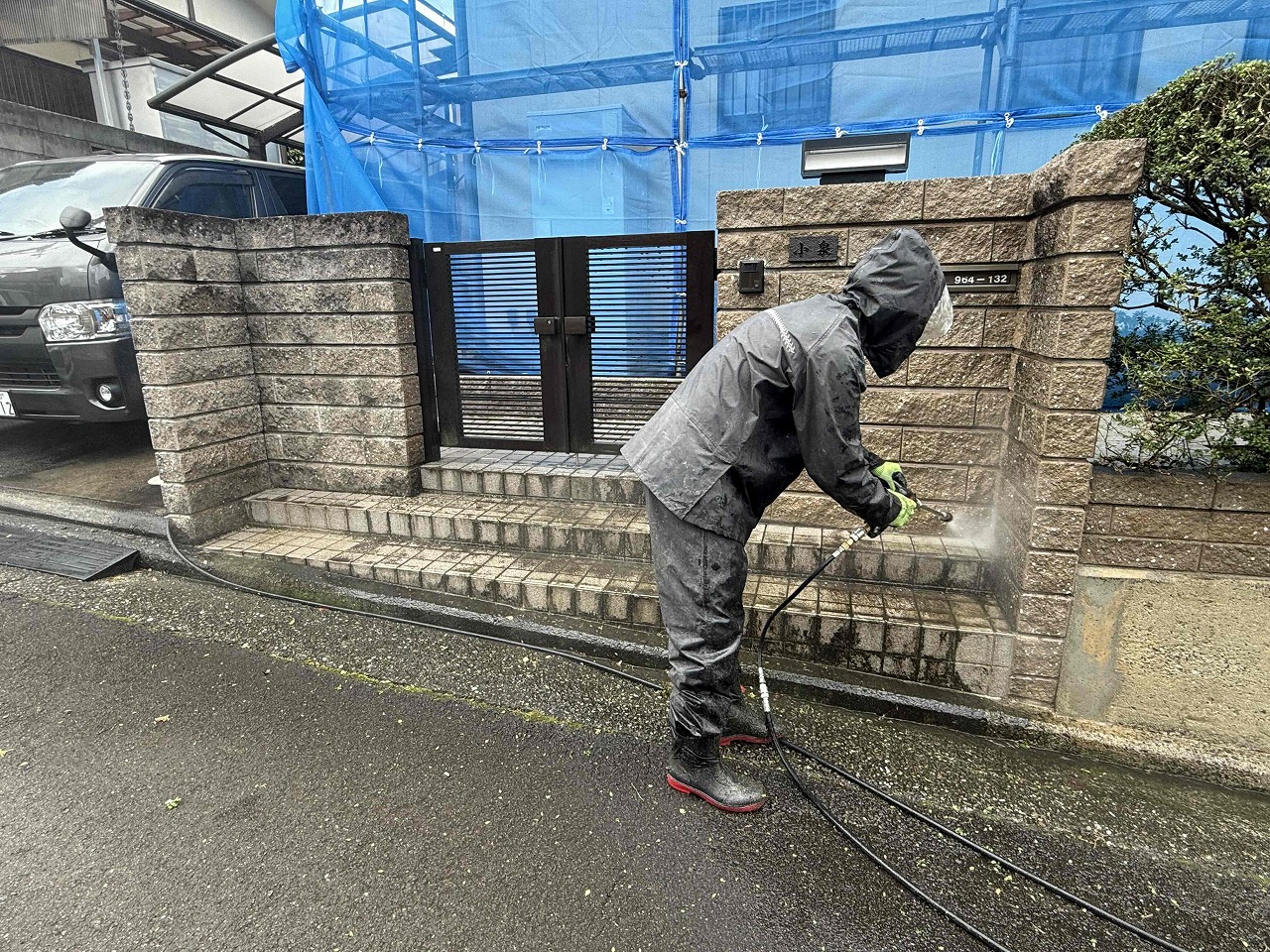 先日、足場の設置が完了しており、本日は屋根・外壁・塀の高圧洗浄を行いました。次回は養生作業を行っていく予定となっております。今回使用する塗料は日本ペイントです。引き続きよろしくお願いいたします!?