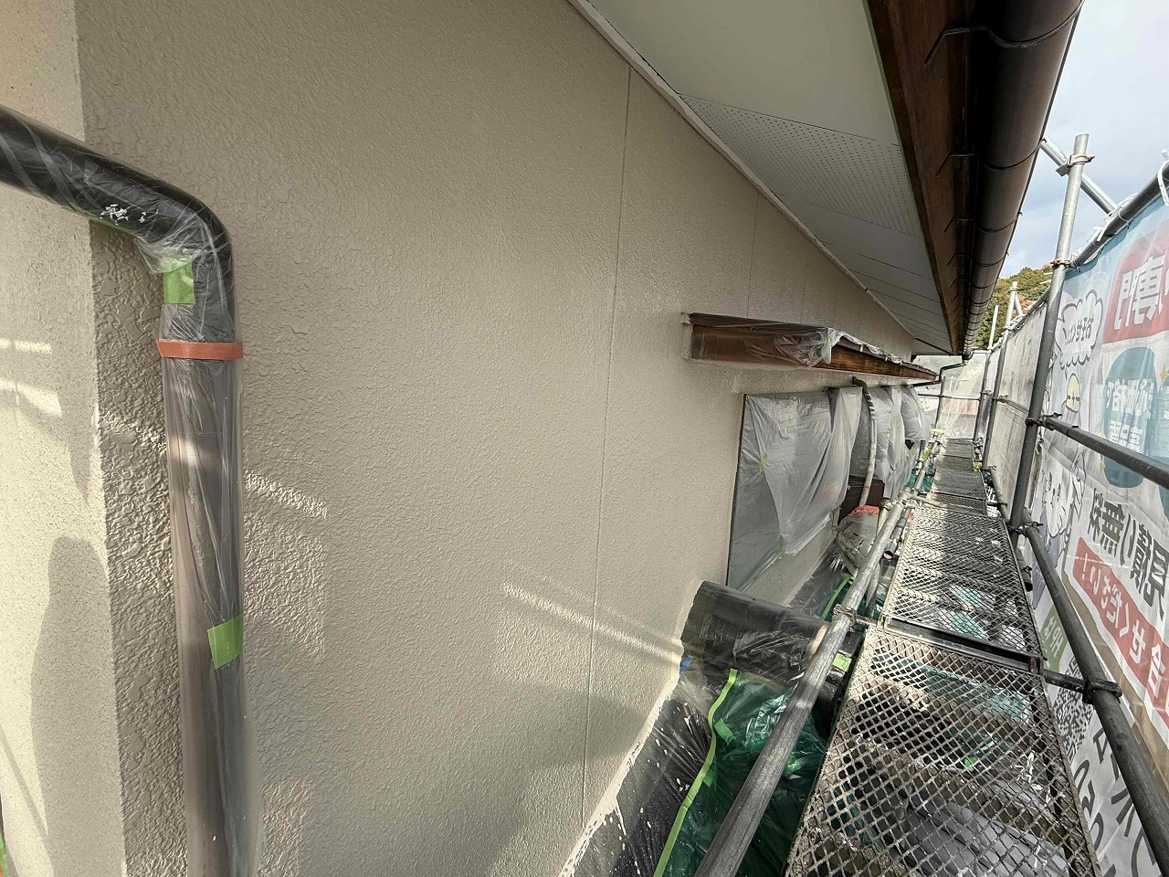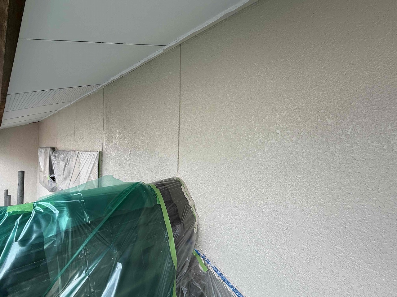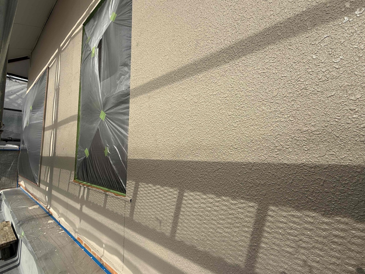 先日、外壁塗装の下塗り(1回目塗装)が完了しており、本日は中塗り(2回目塗装)を行いました。明日は上塗り(3回目塗装)を行っていく予定となっております。引き続きよろしくお願いいたします!