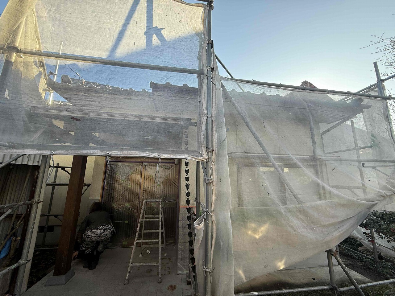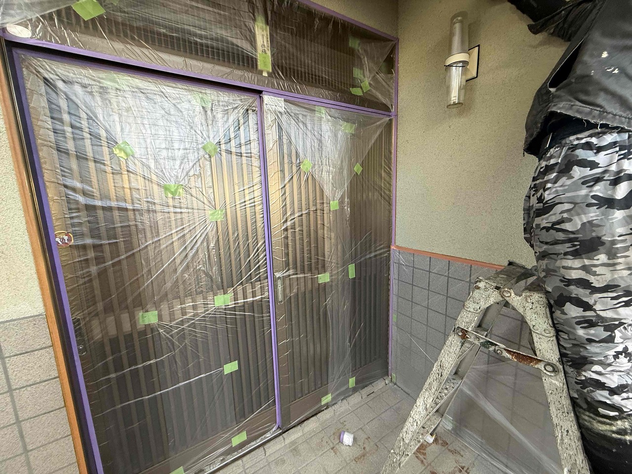 先日、足場設置と高圧洗浄が完了しており、本日は養生作業を行いました。明日より、外壁塗装(日本ペイントパーフェクトトップ)を行っていく予定となっております。引き続きよろしくお願いいたします!?