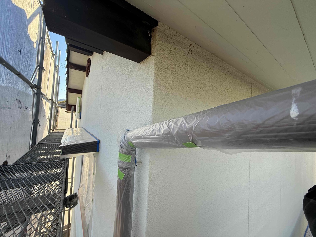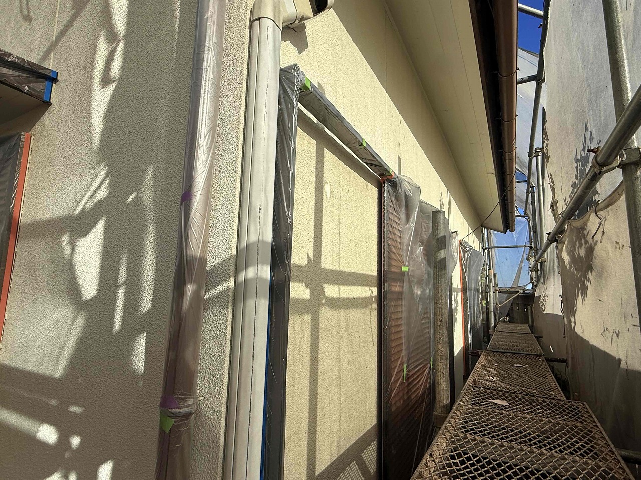 先日、足場設置と高圧洗浄が完了しており、本日は養生作業を行いました。明日は外壁塗装(日本ペイントパーフェクトトップ使用)を行っていく予定となっております。引き続きよろしくお願いいたします!?
