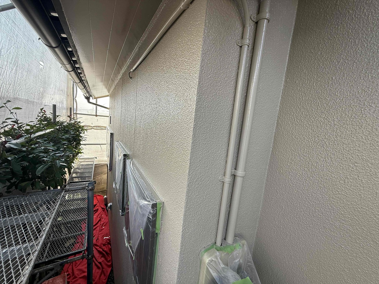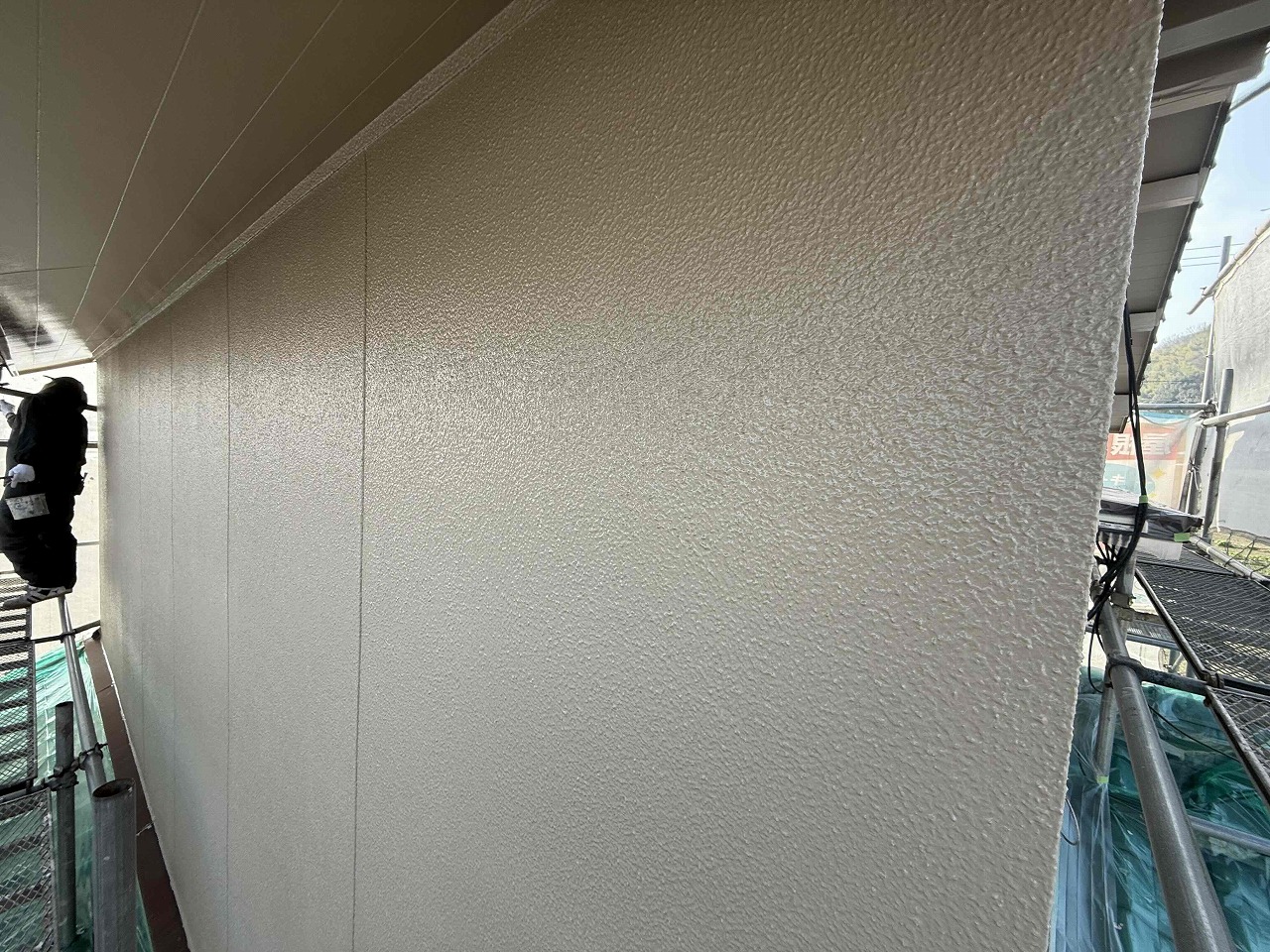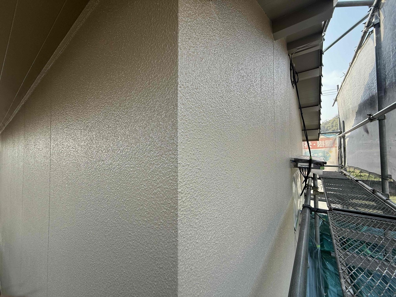 先日、中塗り(2回目塗装)が完了しており、本日は上塗り(3回目塗装)を行いました。明日は雨樋など付帯パーツ類の塗装を行っていく予定となっております。引き続きよろしくお願いいたします!?