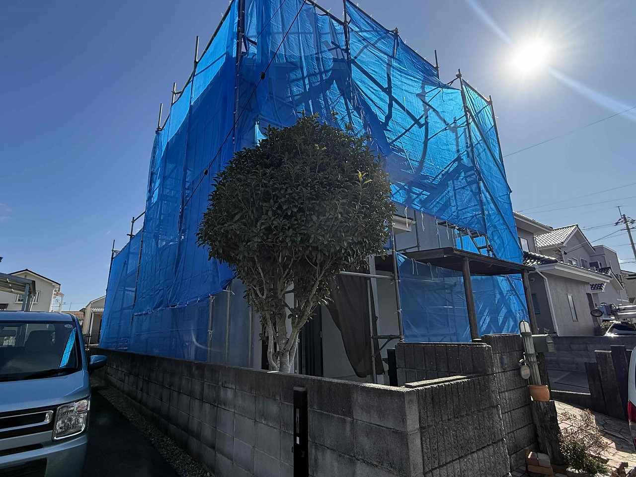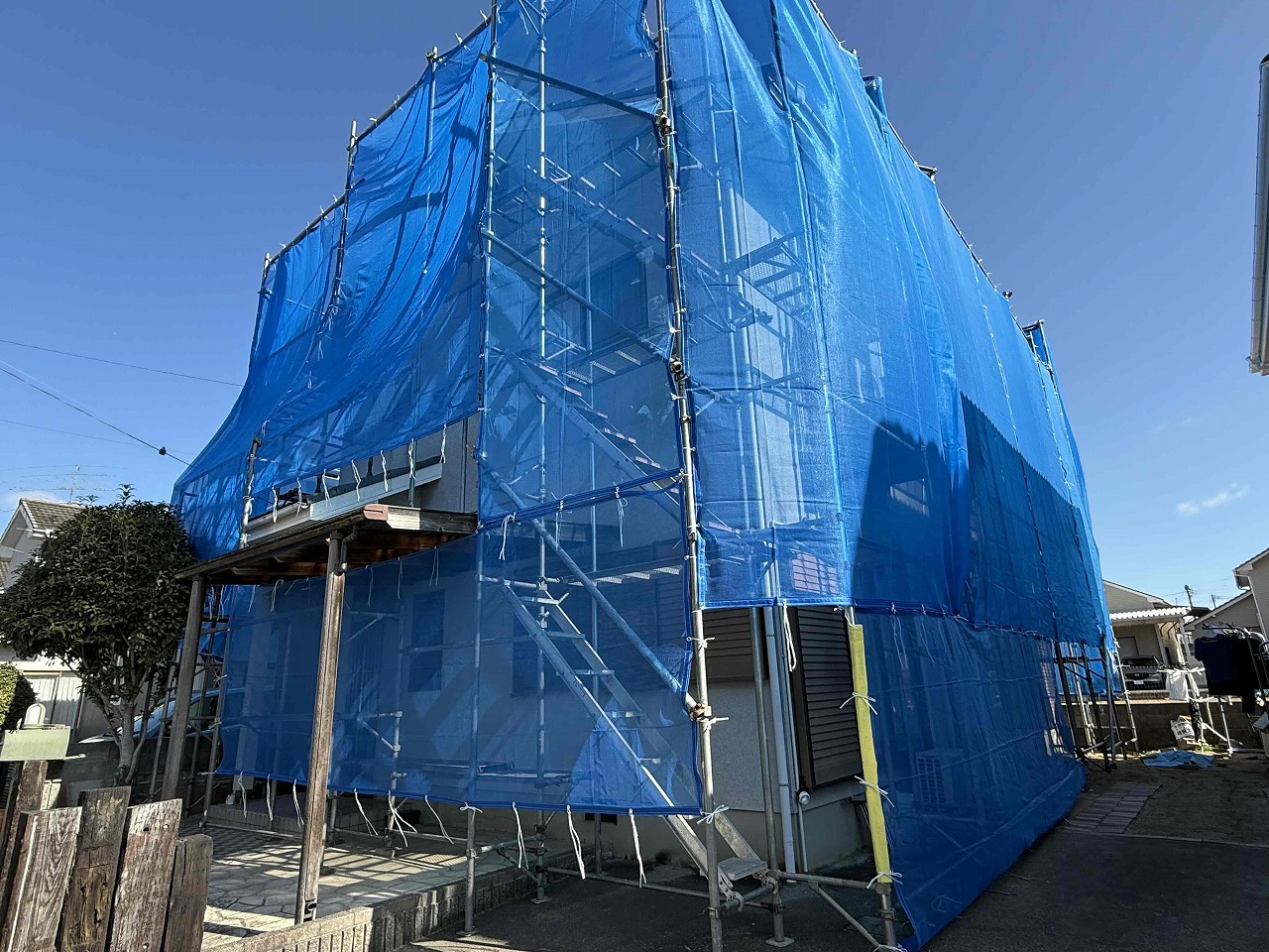 本日、屋根・外壁塗装のための仮設足場を設置いたしました。週明けの月曜日より高圧洗浄を行い、屋根・外壁塗装工事(日本ペイント使用)を行っていく予定となっております。