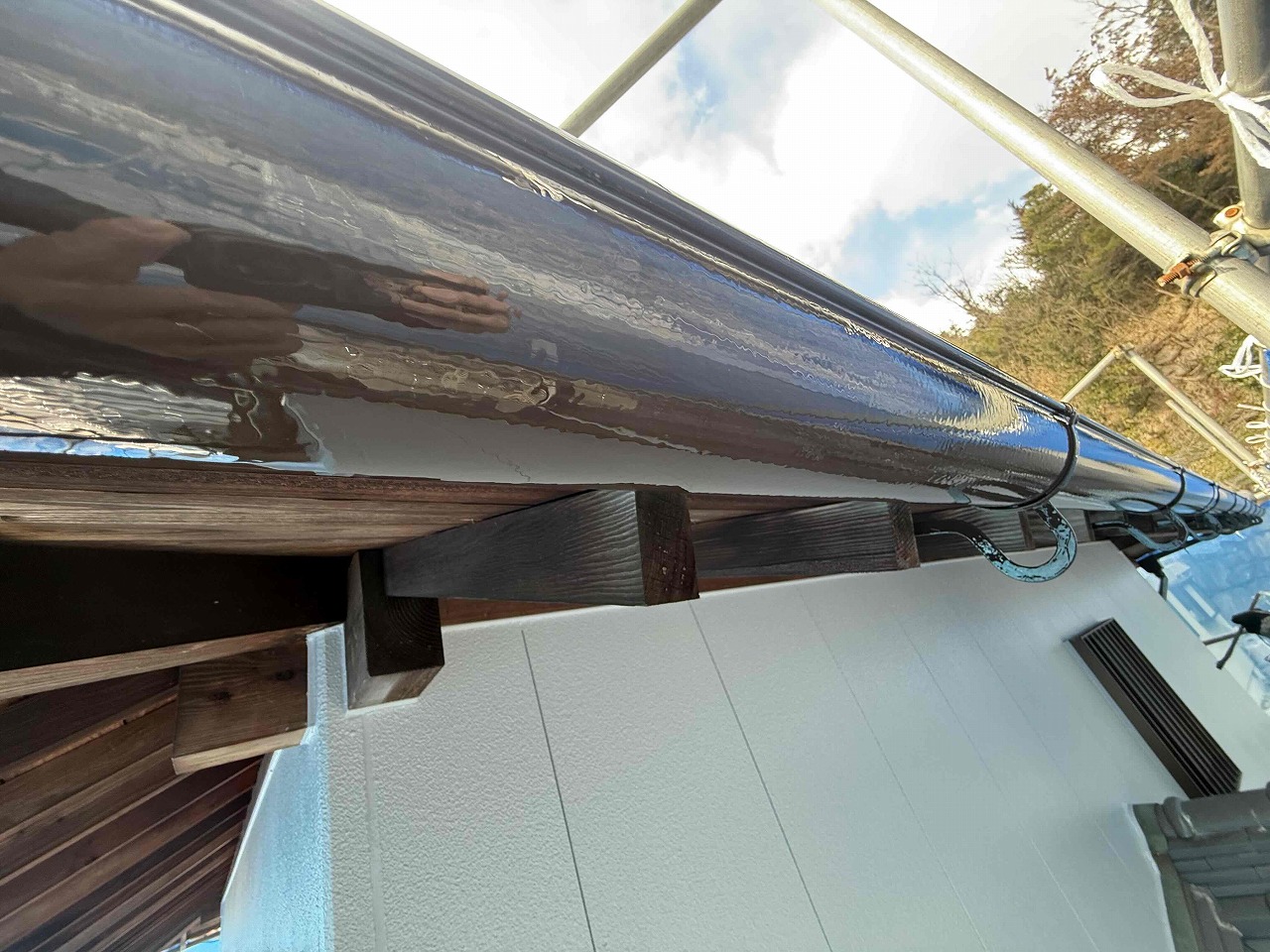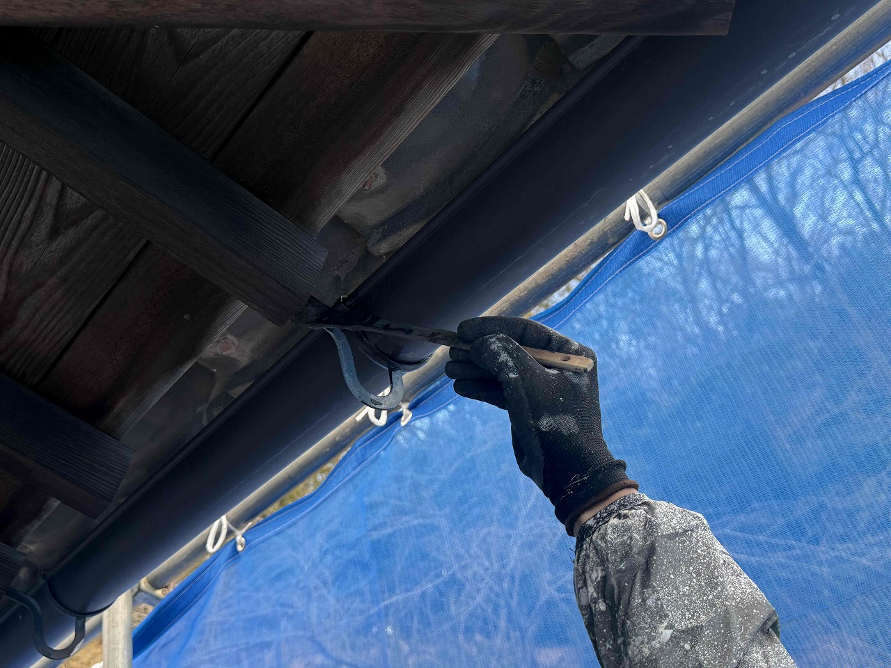 先日、外壁塗装の上塗り(3回目塗装)が完了しており、本日の午前中はスレート屋根の金具の錆止め塗装、午後は雨樋の塗装の1回目塗装を行いました。明日は日曜日で職人が休みのため、月曜日より付帯パーツ類の塗装の続きを行っていく予定となっております。引き続きよろしくお願いいたします!?