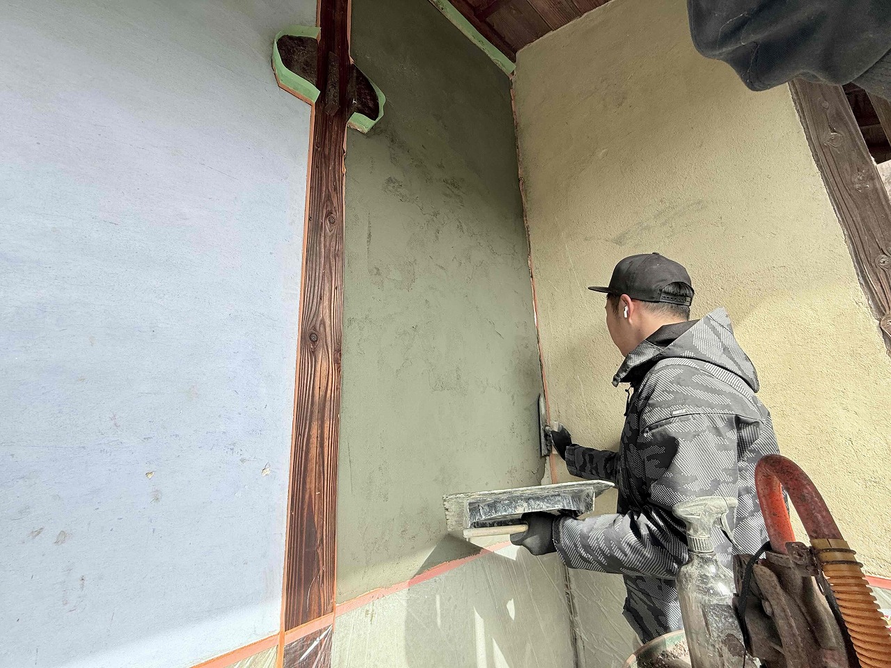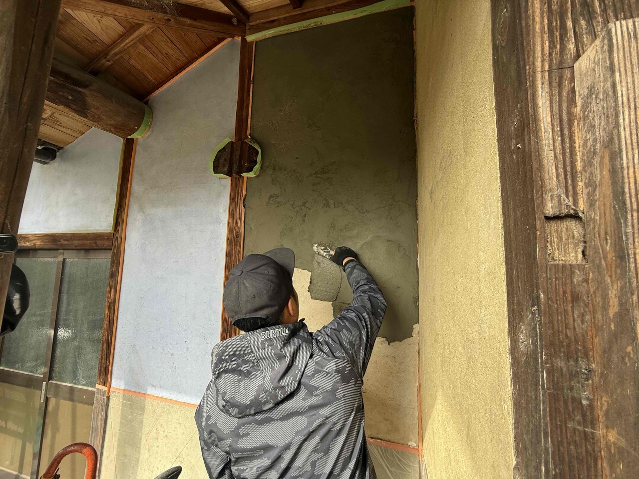 本日、古くなって落下した漆喰壁の補修を左官工事にて行いました。