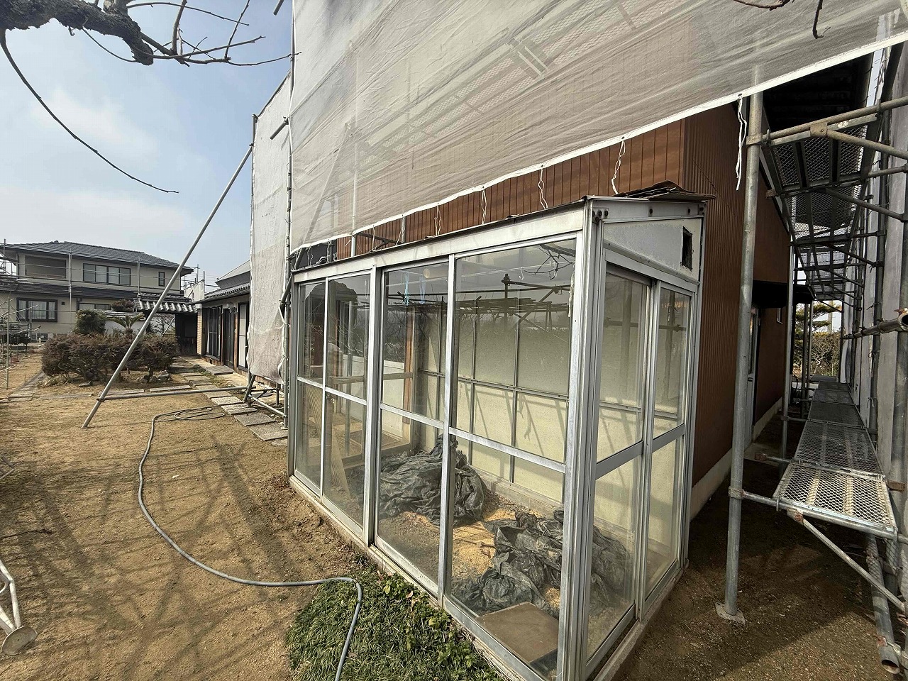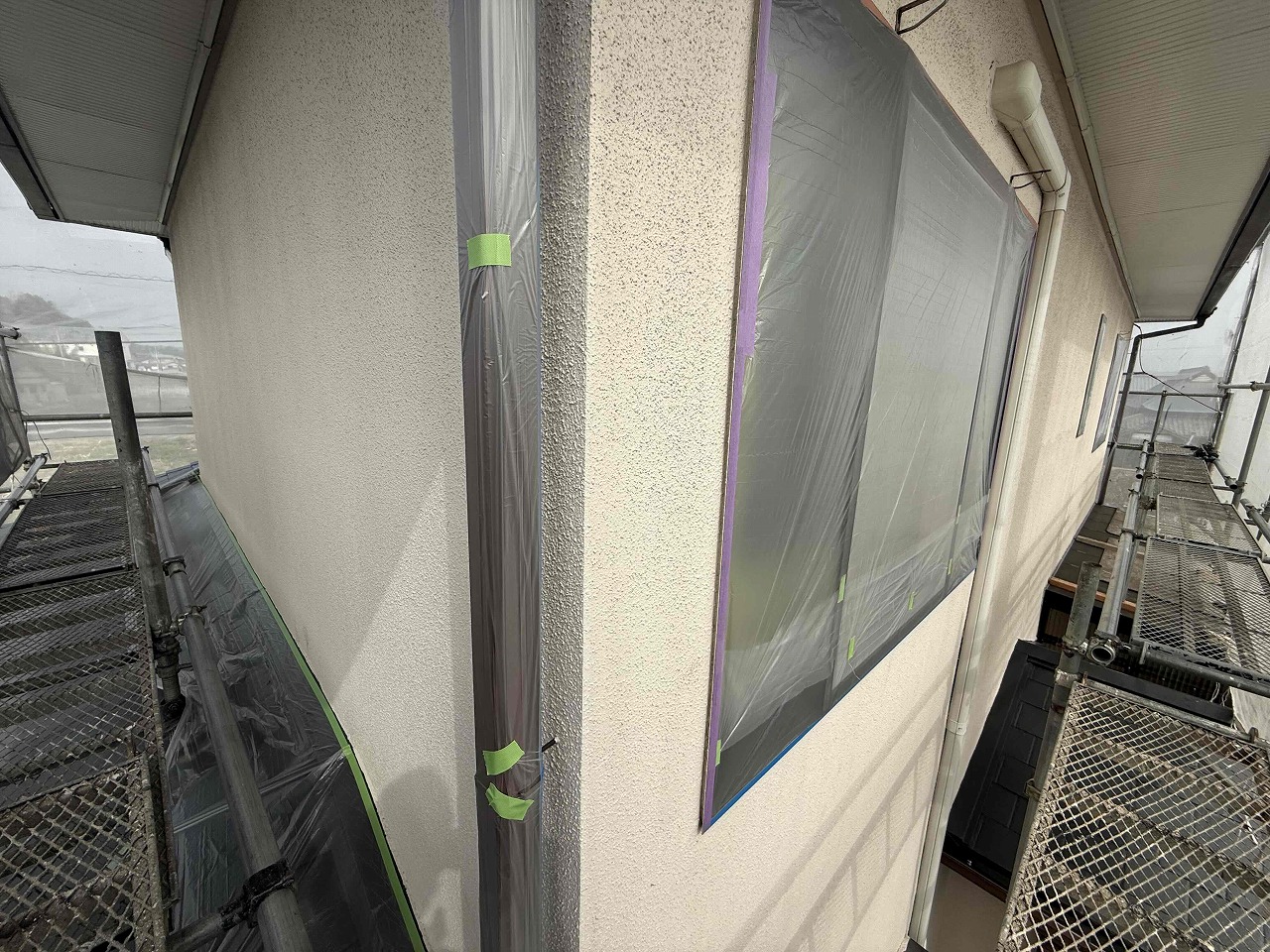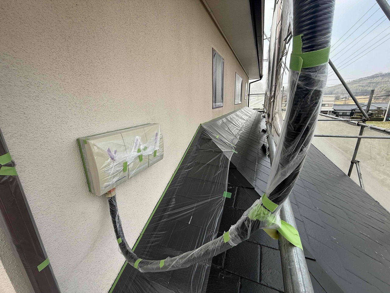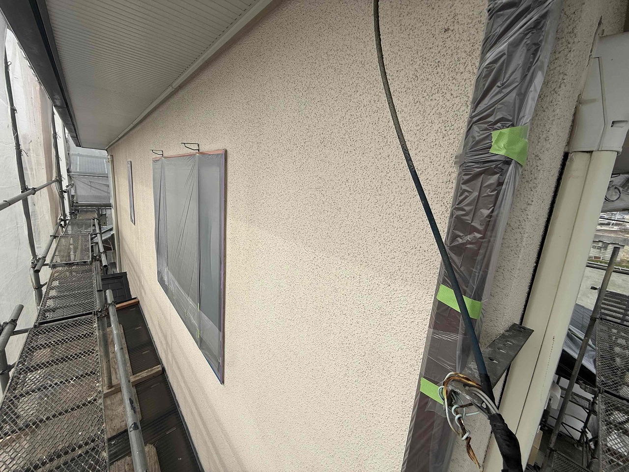 先日、屋根・外壁の高圧洗浄が完了しており、本日は養生作業を行いました。次回も引き続き養生作業を行っていく予定となっております。引き続きよろしくお願いいたします!?