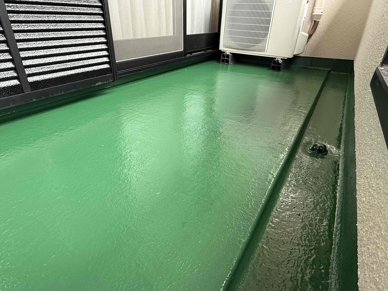 午後より細かい部分の手直しやベランダ防水(上塗り)を行いました。