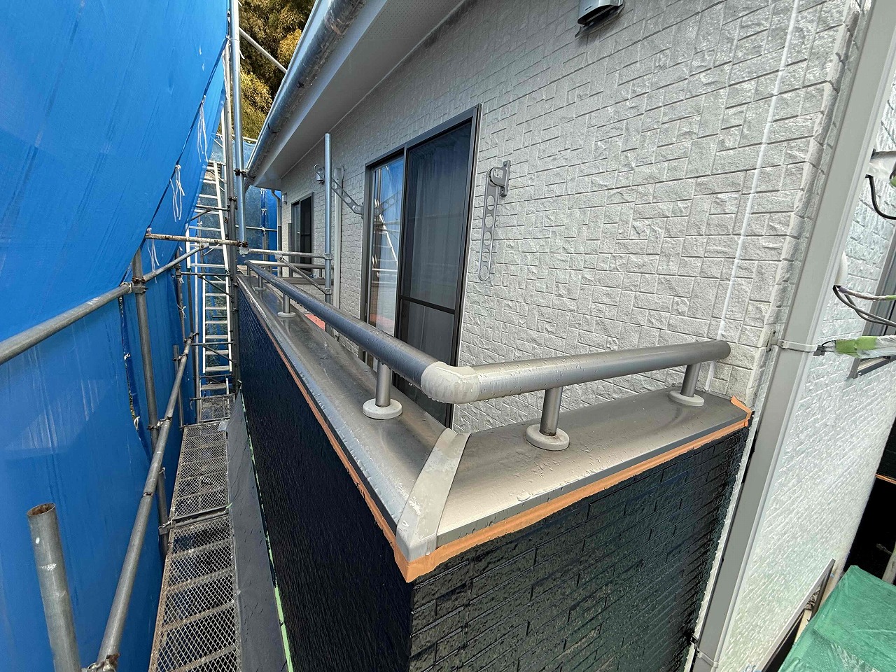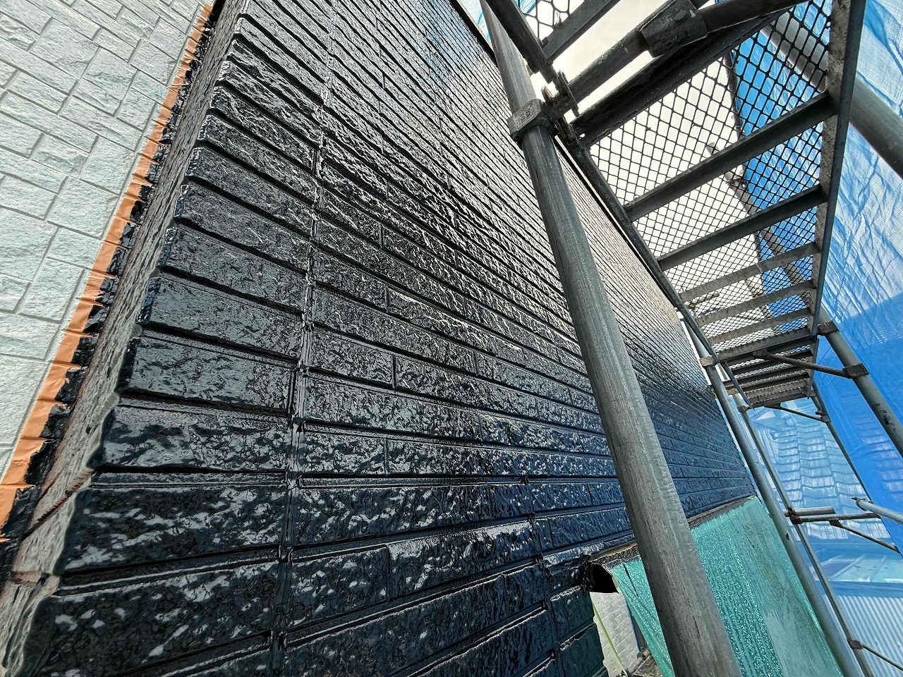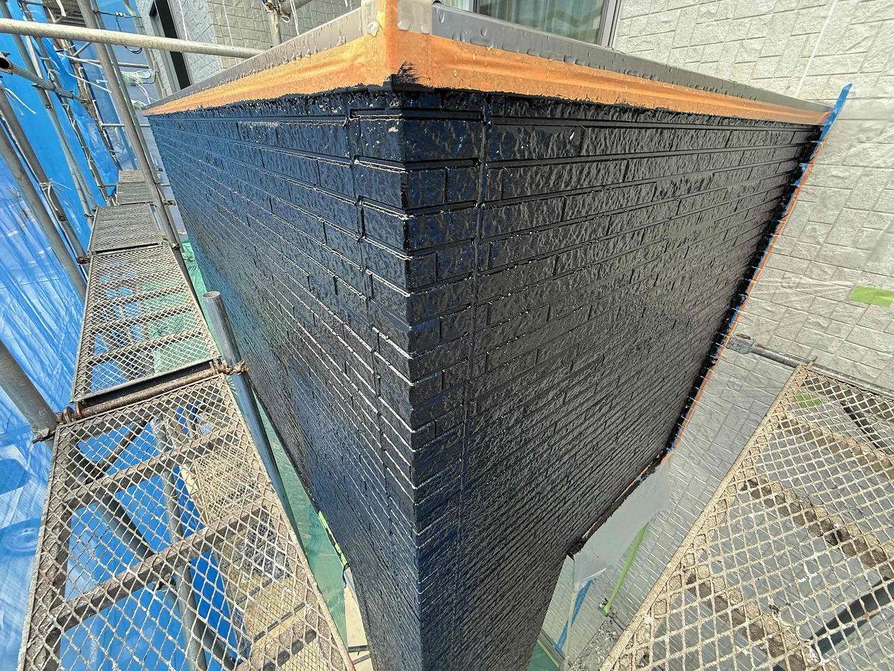 先日に引き続き、外壁塗装の上塗りを行いました。今回は、玄関上とベランダの側部を色分けさせて頂きました。夕方より雨の予報となっていたため、本日は昼過ぎで工事を中止させて頂きました。明日も引き続きよろしくお願いいたします!?