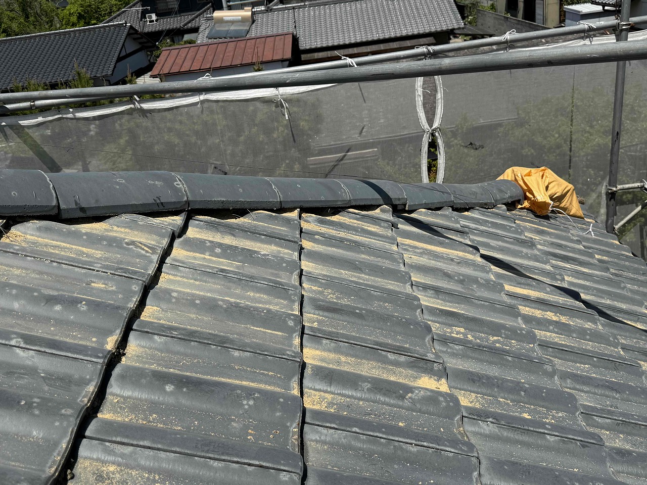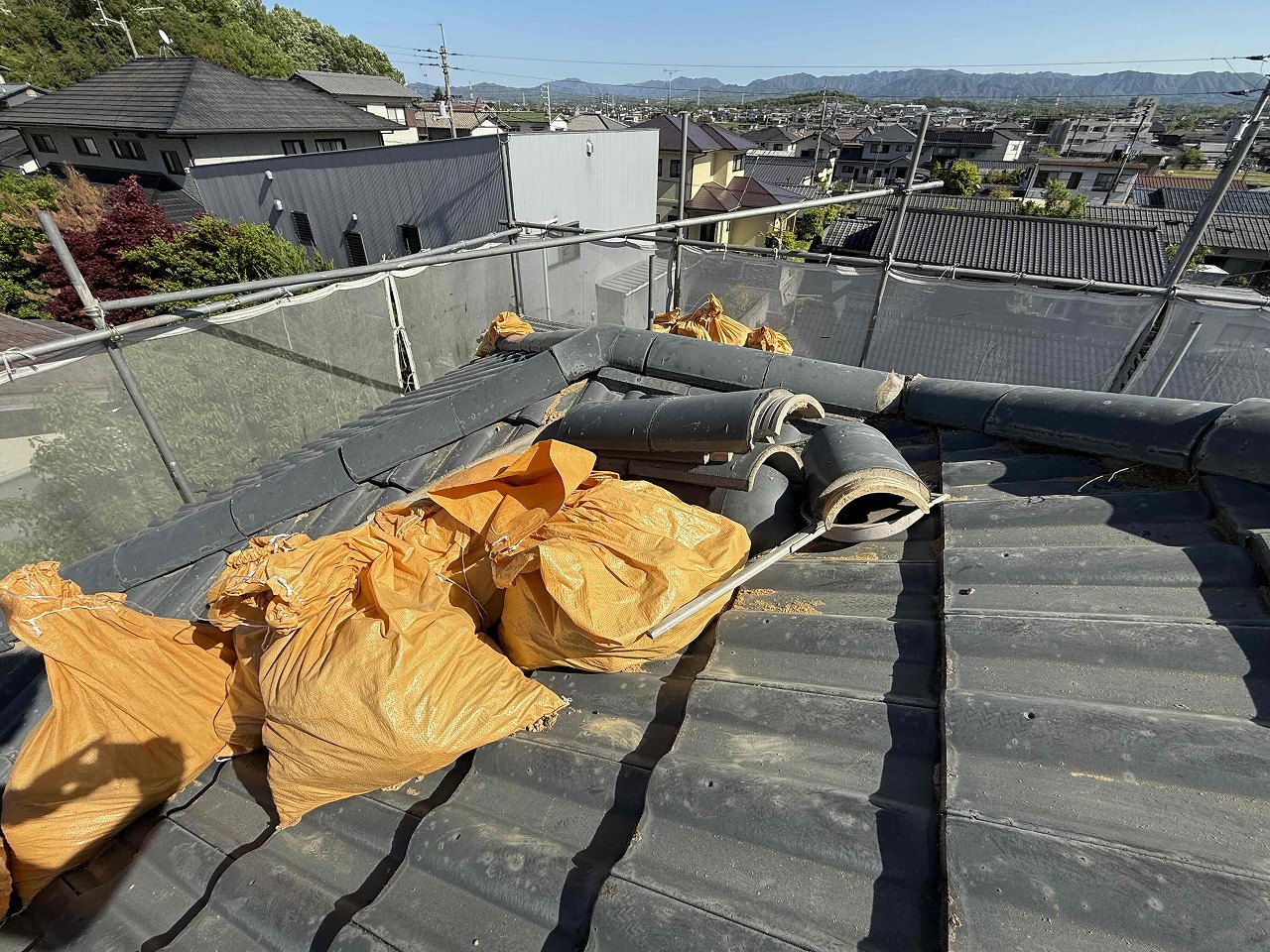 本日は瓦の下の漆喰や土などの撤去を行いました。明日は、瓦を撤去し、撤去した部分からルーフィング(防水シート)を行っていく予定となっております。引き続きよろしくお願いいたします!?