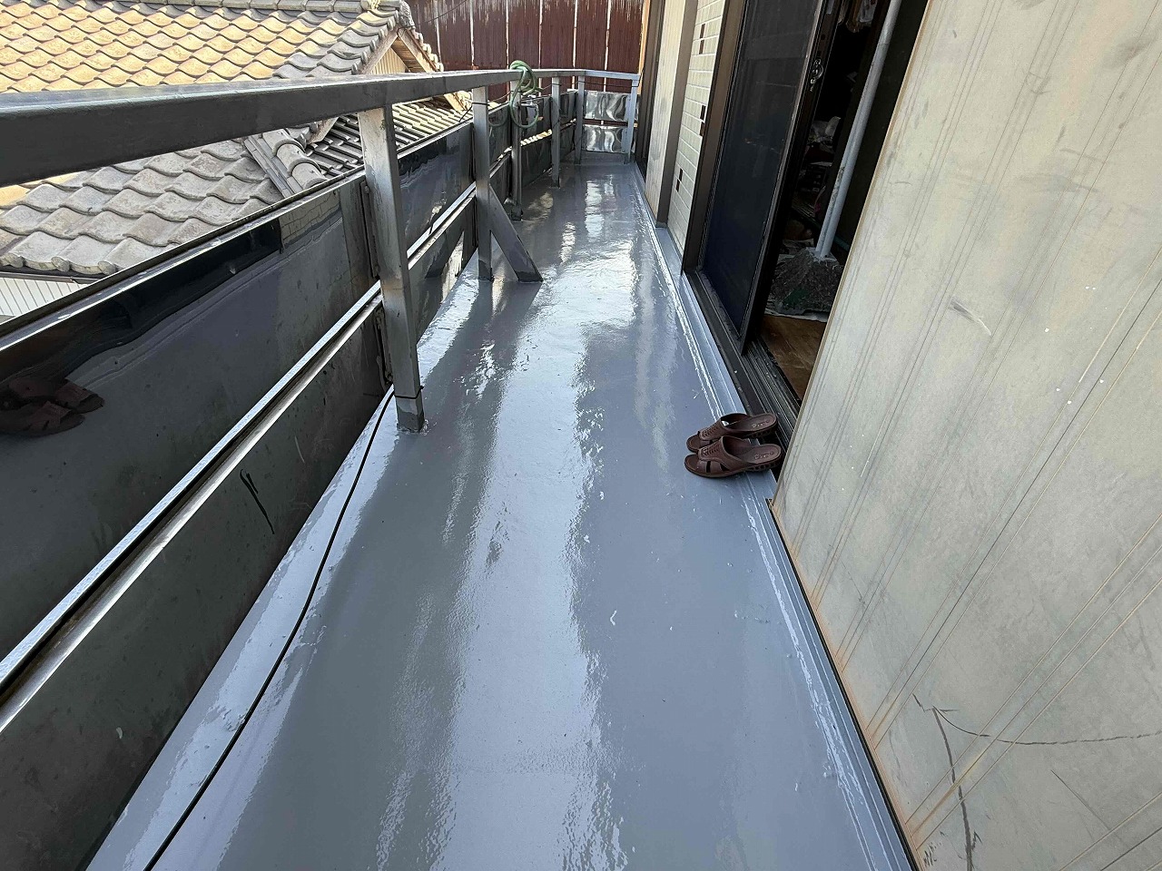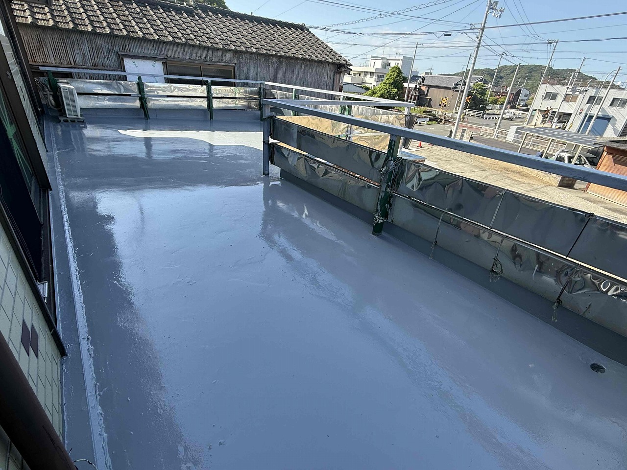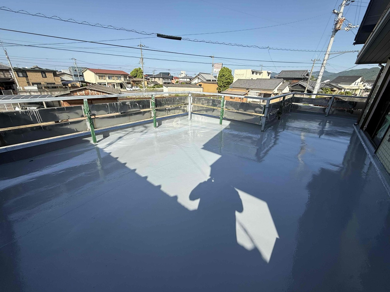 先日、防水(ウレタン防水)を行い、本日はトップコート(3回目塗装)を行いました。こちらの現場はこれにて全ての工事が完了いたしました!