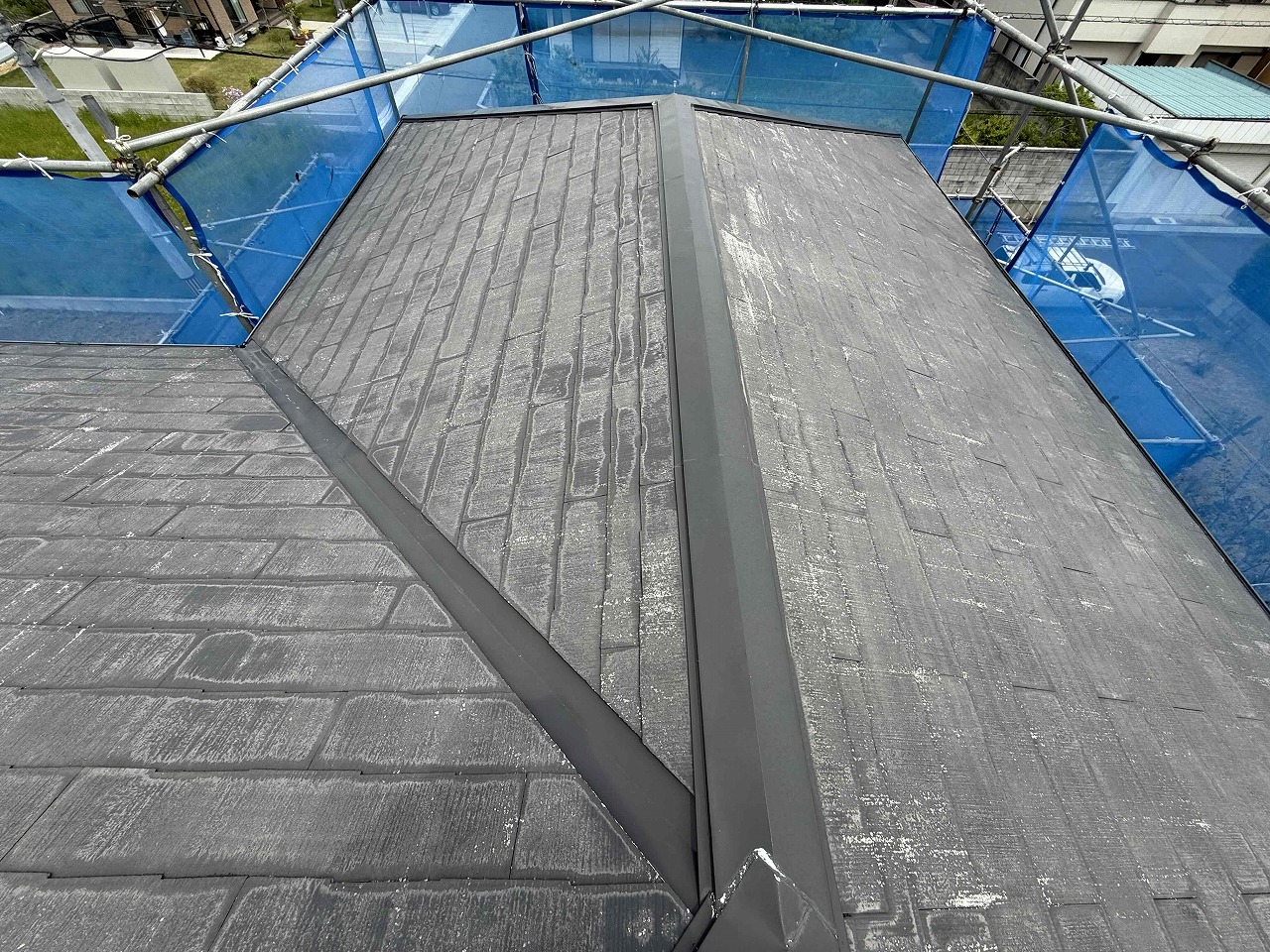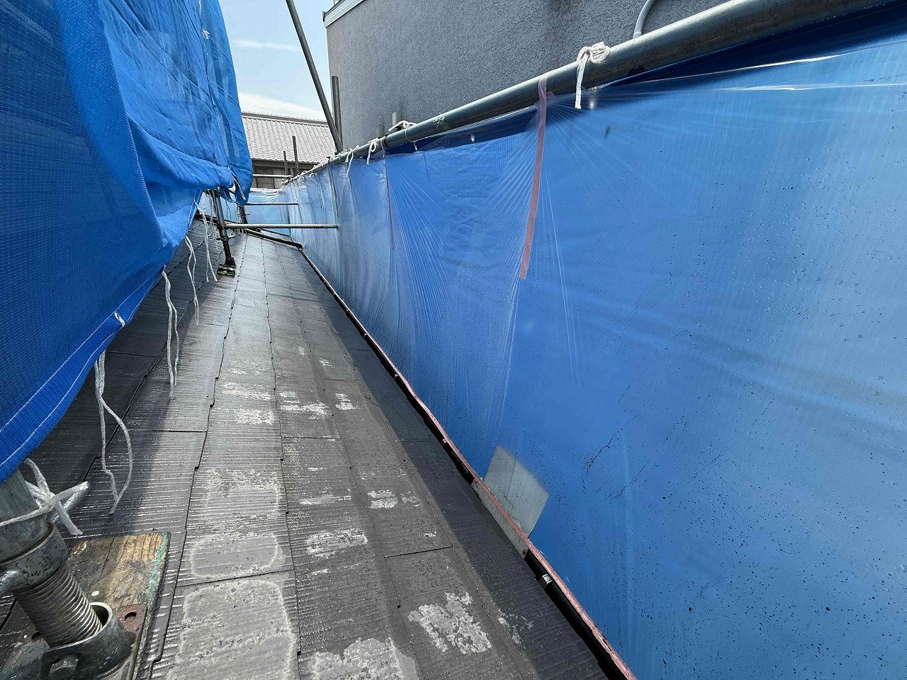 先日、足場の設置が完了しており、本日は屋根塗装(日本ペイントファインパーフェクトベスト)工事前の高圧洗浄を行い、既存の古くなったコケ等を綺麗に取り除かせていただきました!お隣のお家が近いため、事前にご挨拶はさせていただいていますが、念のために、メッシュシート+ブルーシートを施し、その内側に養生を行い万全の対策をとらせていただきました。