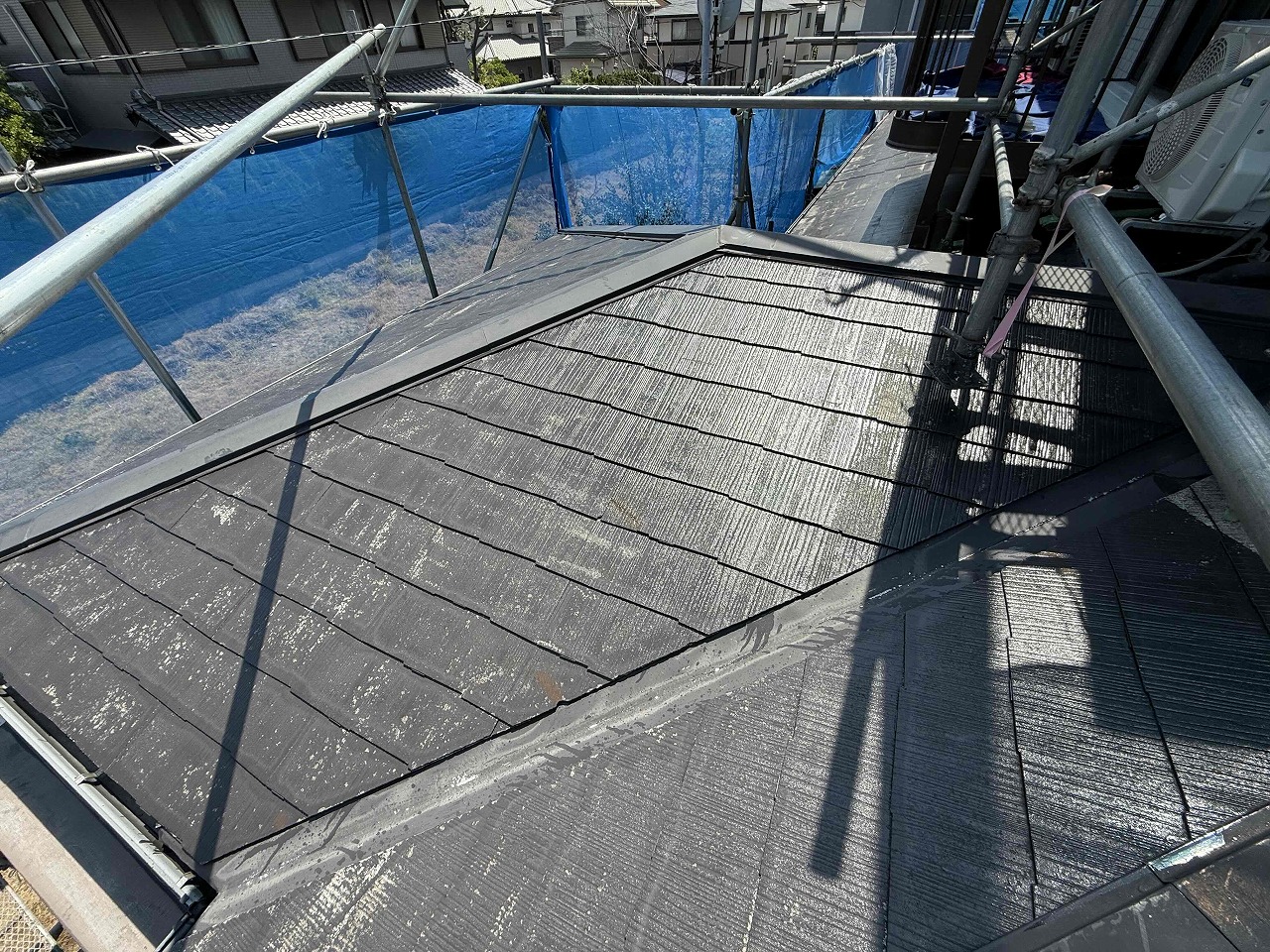 先日、屋根塗装の下塗り(写真2枚目)を行い、本日、中塗り(写真3枚目)を行いました。明日は上塗り(3回目塗装)を行っていく予定となっております。引き続きよろしくお願いいたします!?