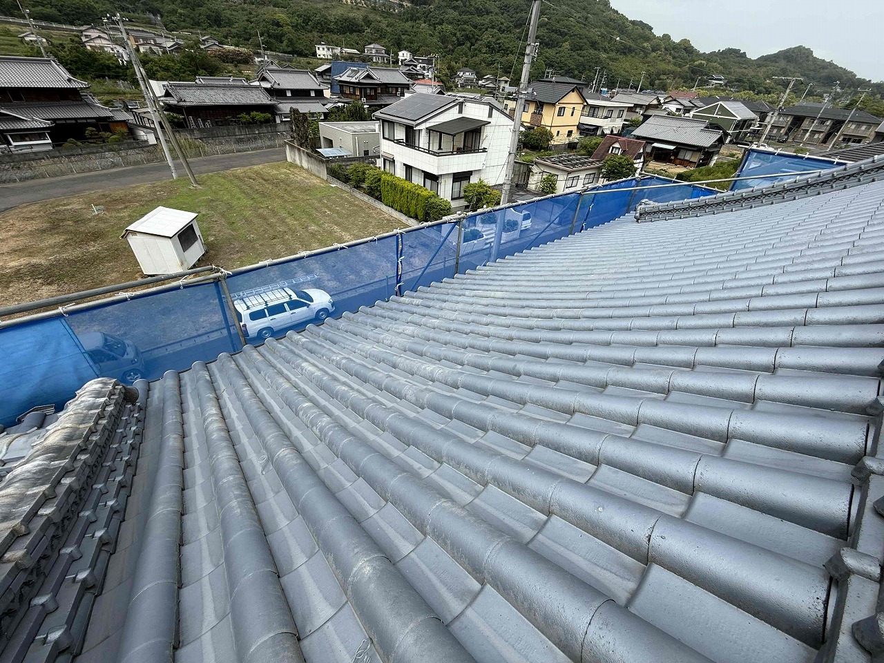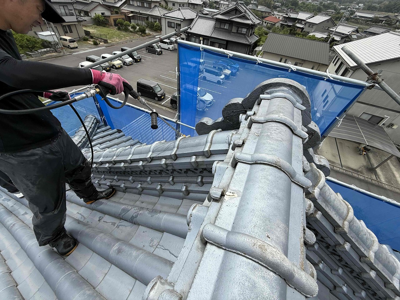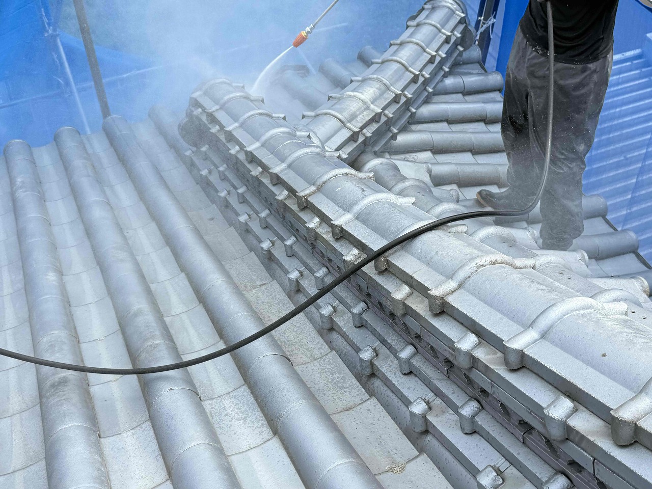 先日、仮設足場の設置が完了しており、本日、屋根の高圧洗浄を行いました!