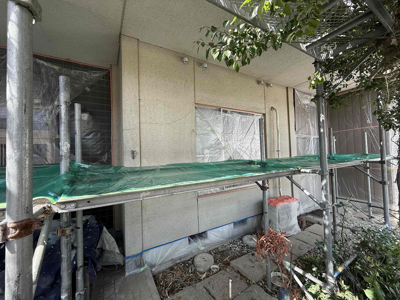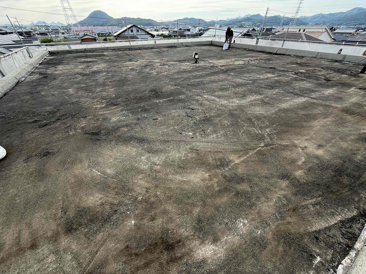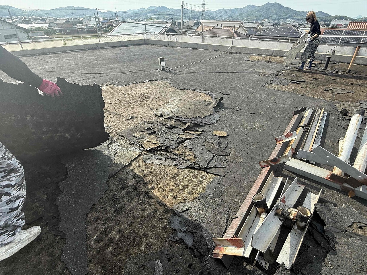 先日、養生作業が完了しており、本日クラック補修と2階屋上の古くなった防水シートの撤去を行いました。明日、シート撤去後のお掃除等を行い、防水工事ができる準備を行っていく予定となっております。引き続きよろしくお願いいたします!?