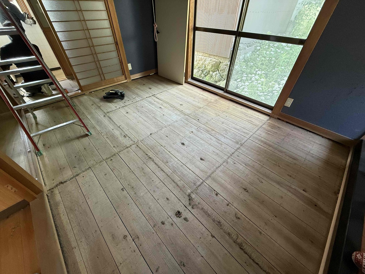 先日に引き続き、内装工事を行いました。本日はシャワールームを備え付ける箇所の解体を行い、そのあと畳を撤去し、処分する棚の解体作業を行いました。まだ、工事は始まったばかりですが、引き続きよろしくお願いいたします!?